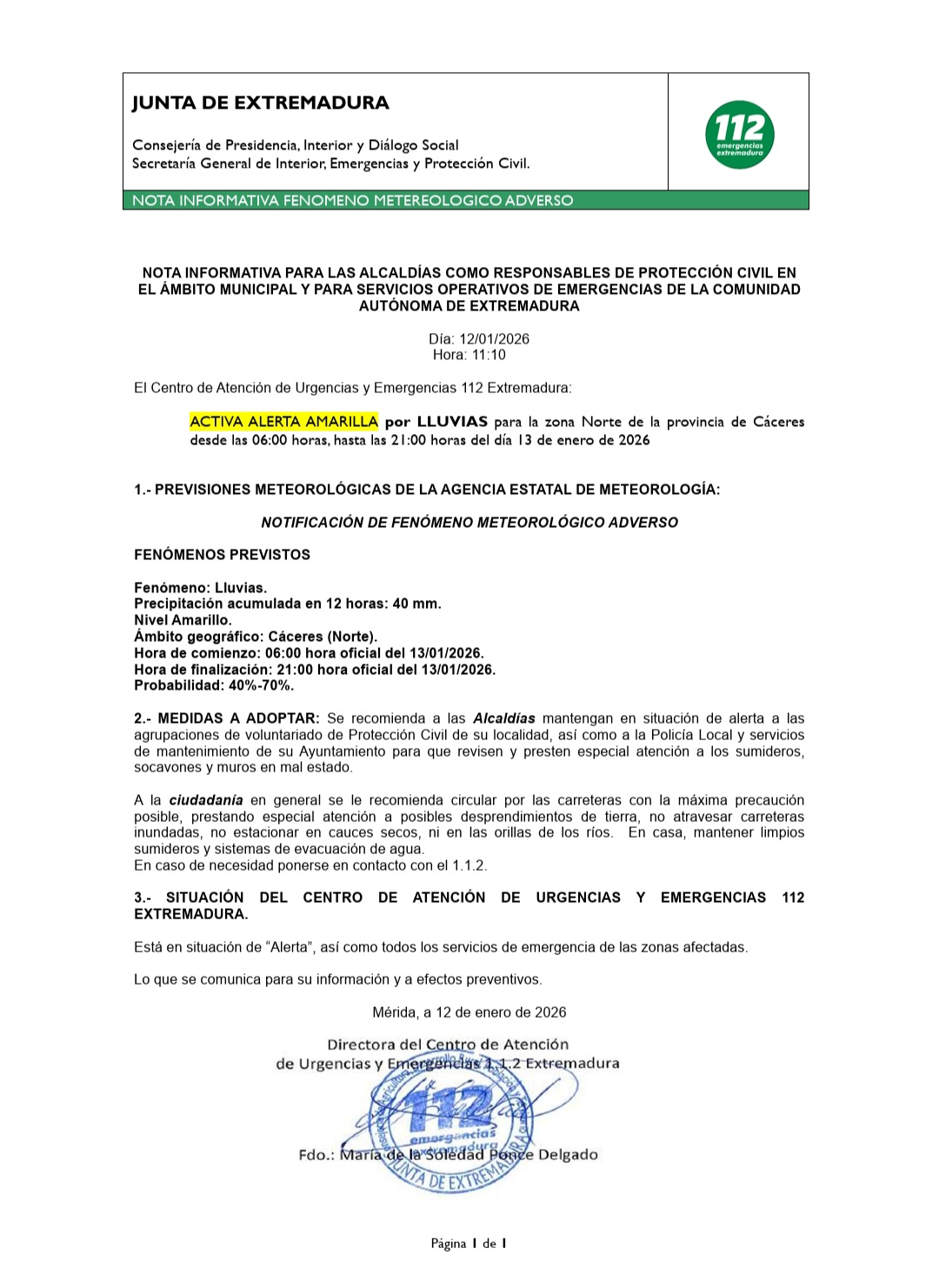 🚨 Se informa a la población, según comunicación del 112, de la activación de alerta amarilla por lluvias.