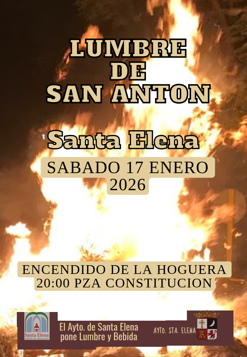 El Ayuntamiento de Santa Elena, organiza la tradicional "Lumbre de San Antón" en la que aportará bebida para los asistentes que deberán traer su propios avíos para la barbacoa. Será el Sábado 17 de Enero en la Pza. de la Constitución a partir de las 20:00 h.