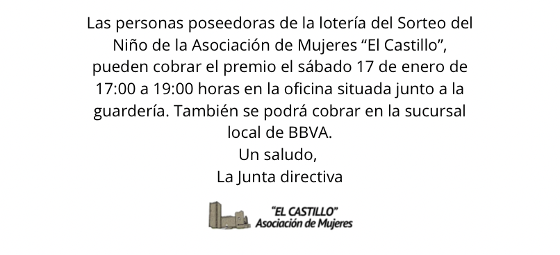 Las personas poseedoras de la lotería del Sorteo del Niño de la Asociación de Mujeres "El Castillo", pueden cobrar el premio el sábado 17 de enero de 17:00 a 19:00 horas en la oficina situada junto a la guardería. También se podrá cobrar en la sucursal local de BBVA.