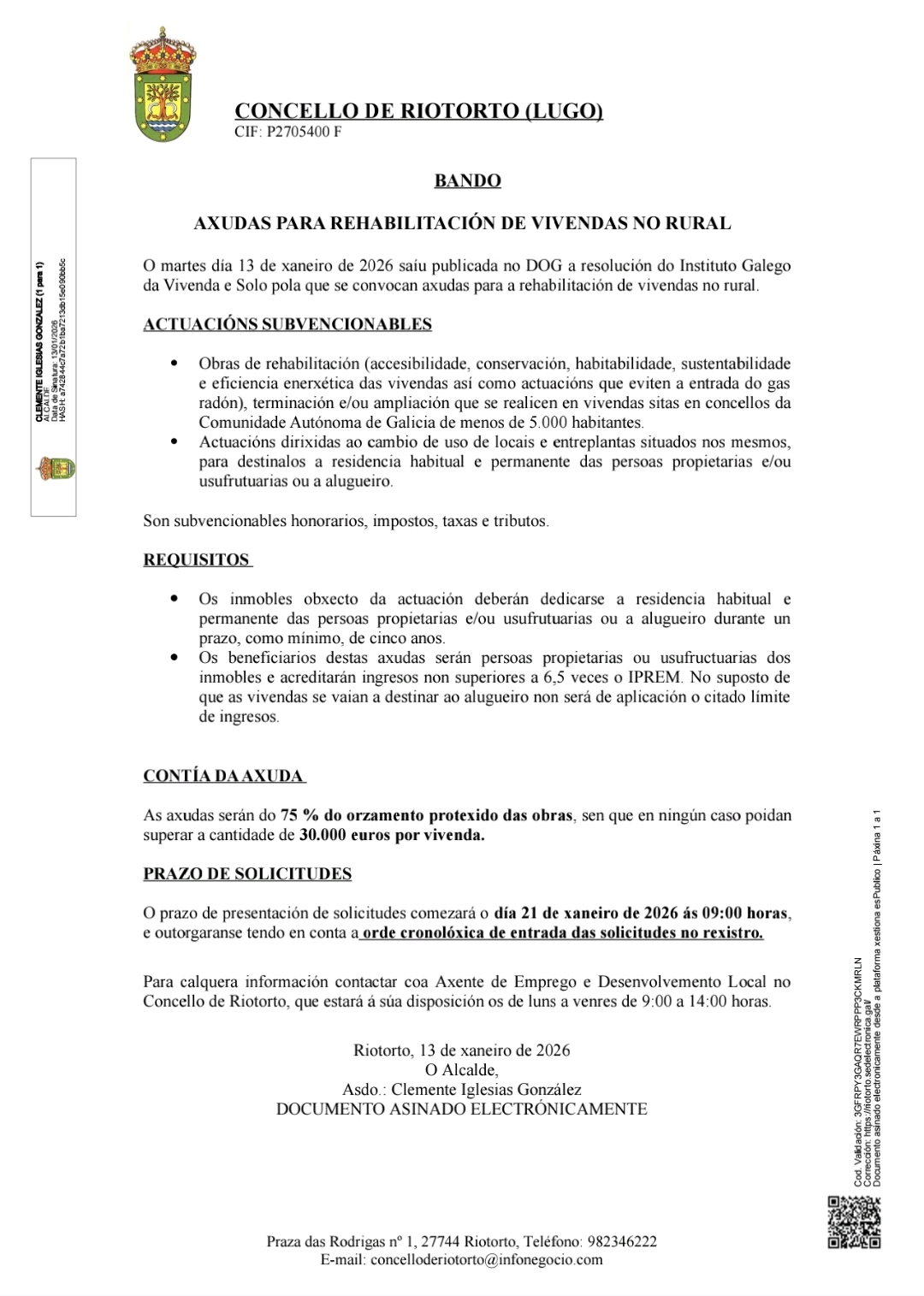 As axudas cubrir谩n o 75% do orzamento, cun l铆mite de 30.000 euros por vivenda. O prazo inicia o m茅rcores, 21 de xaneiro, 09:00 h, e as subvenci贸ns concederanse por orde de presentaci贸n ata esgotar o cr茅dito.
