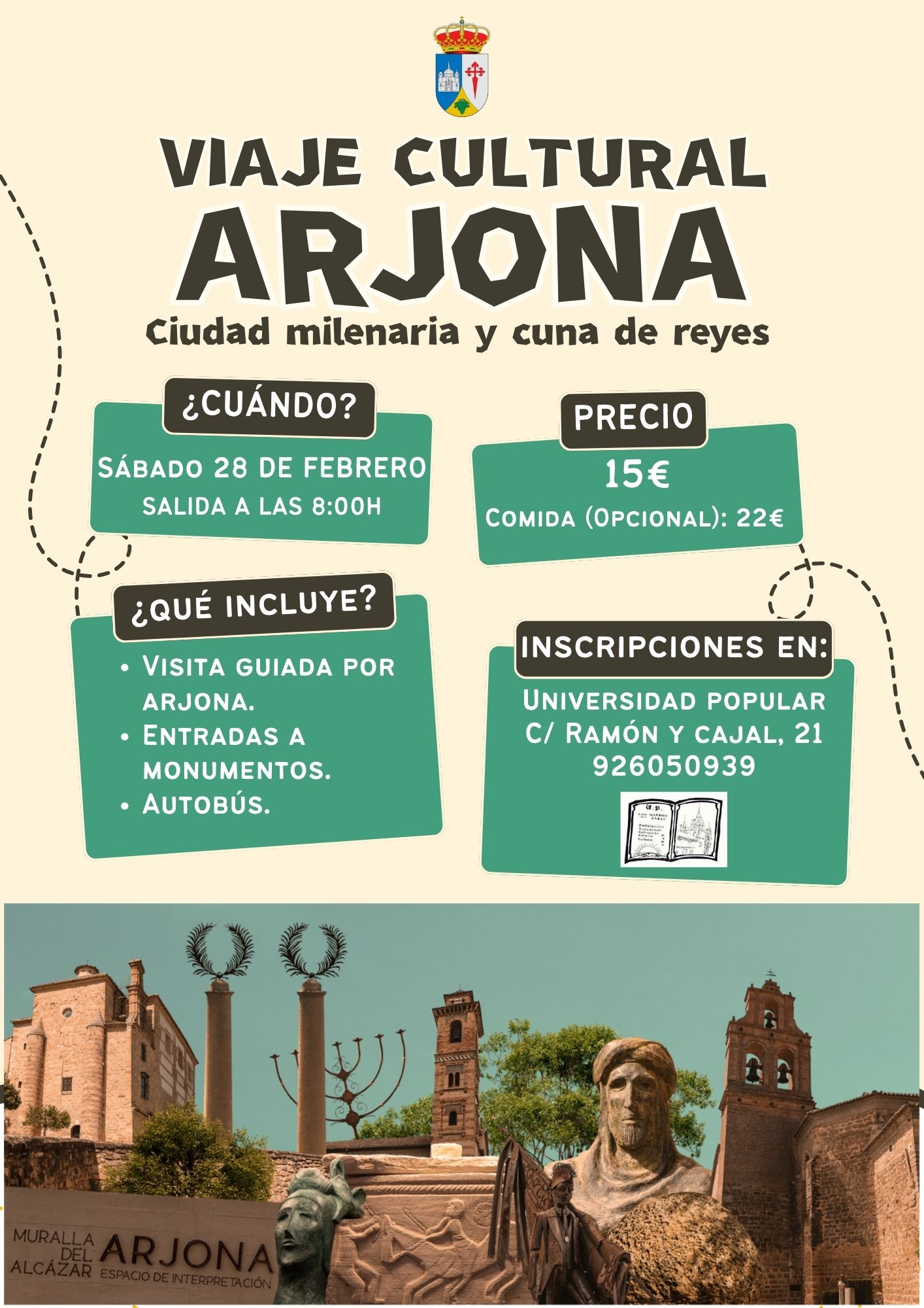 La Universidad Popular organiza un viaje a ARJONA, ciudad milenaria y cuna de reyes.Se realizará el sábado 28 de febrero, con salida a las 8:00h.Inscripciones en la Oficina de la Universidad Popular.