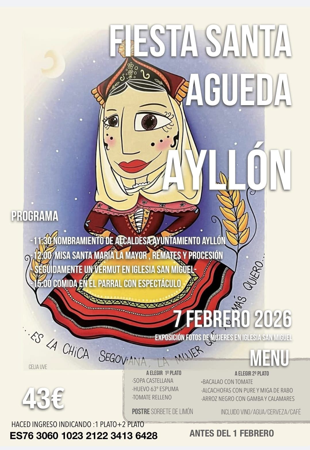 El próximo sábado 7 de febrero, con motivo de la celebración de santa Águeda, se desarrollará una jornada festiva que comenzará a las 11.30 con el nombramiento de la alcaldesa, seguida de la celebración de una misa en la iglesia de Santa María la Mayor. Posteriormente se ofrecerá un vermú en la iglesia de San Miguel.