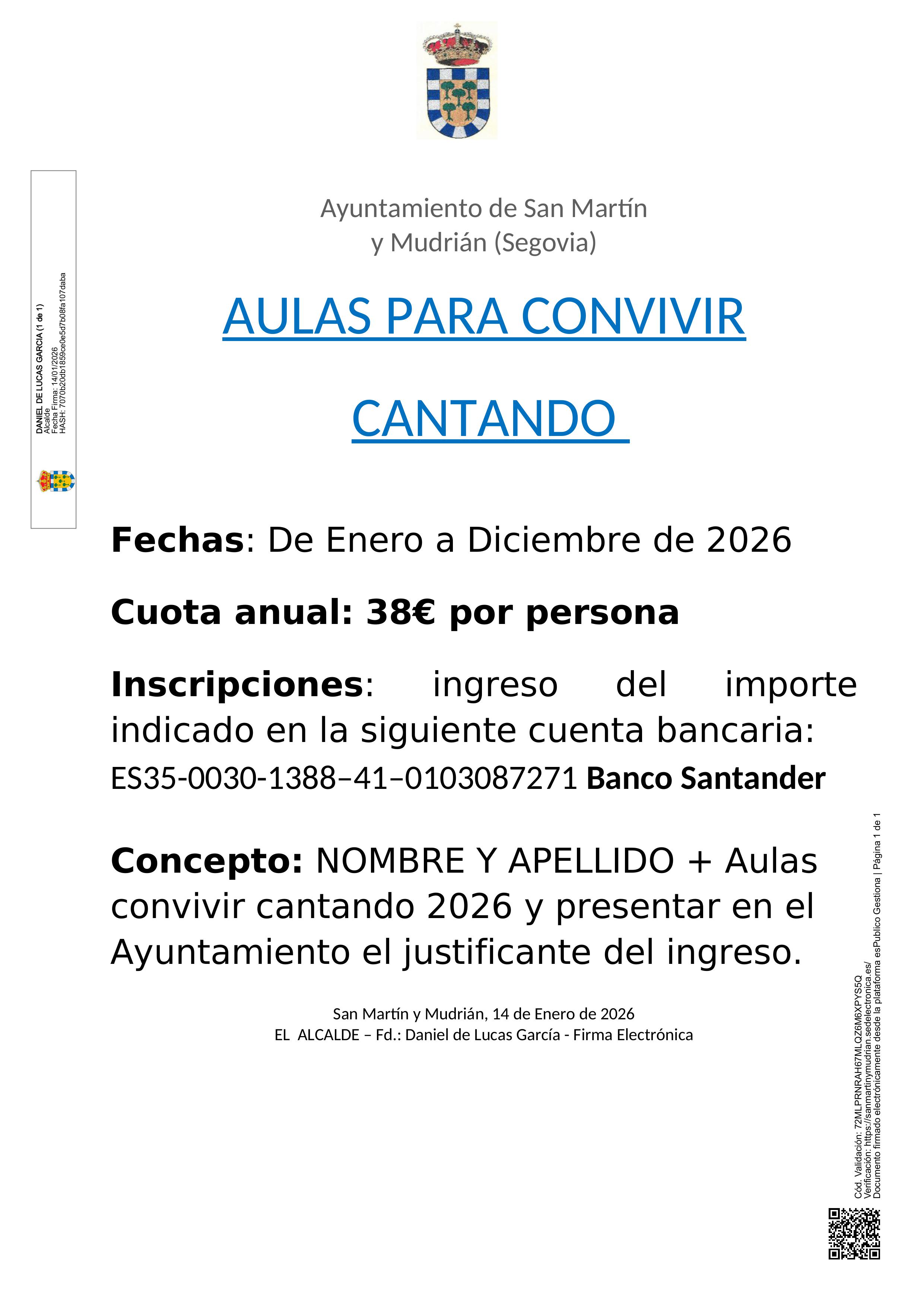 El Ayuntamiento de San Martín y Mudrián informa del inicio de las clases de coro “Aulas para convivir cantando”.
