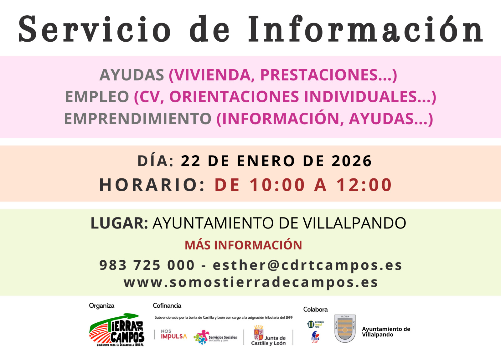 JUEVES 22 DE ENERO DE 10 A 12 HORASSALON DEL AYUNTAMIENTO DE VILLALPANDOInformación sobre ayudas viviendas, prestaciones, empleo....COLECTIVO TIERRA DE CAMPOS