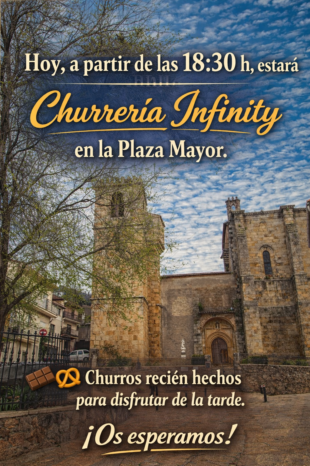 Hoy, a partir de las 18:30 h, estará la Churrería Infinity en la Plaza Mayor.Churros recién hechos para disfrutar de la tarde.