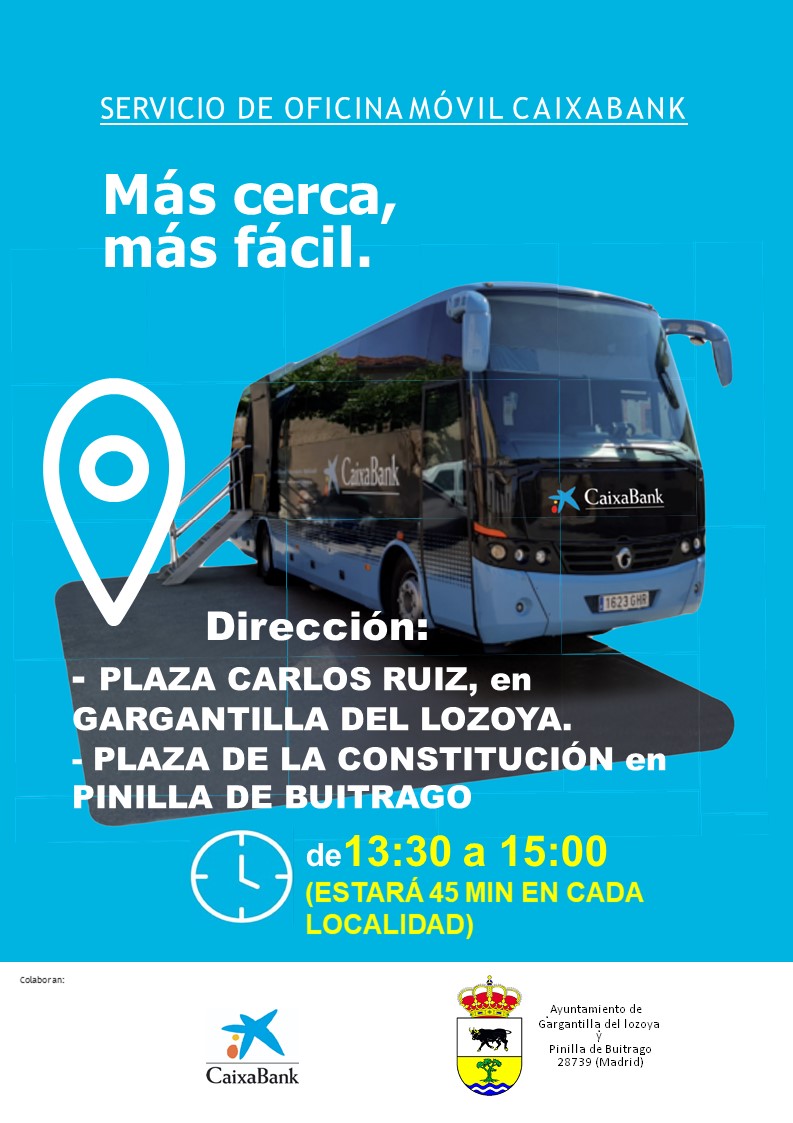 OFICINA MÓVIL CAIXABANKDirección: - PLAZA CARLOS RUIZ, en GARGANTILLA DEL LOZOYA. - PLAZA DE LA CONSTITUCIÓN en PINILLA DE BUITRAGOMARTES 24 de febrero de 2026De11:30 a 13:00 (ESTARÁ 45 MIN EN CADA LOCALIDAD)