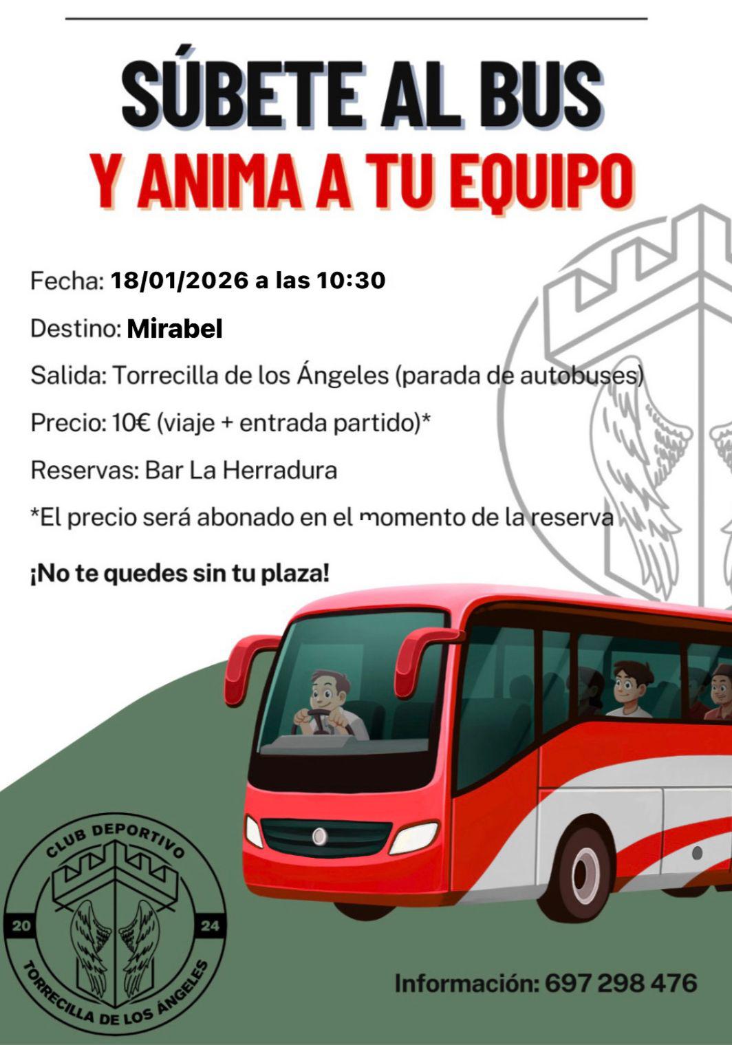 Se informa a todos que el próximo domingo 18 de enero de 2026 se organizará un viaje en autobús para asistir al partido que se celebrará en Mirabel , con salida a las 10:30 horas desde la parada de autobuses de Torrecilla de los Ángeles. El precio será de 10€ , incluyendo viaje y entrada al partido , que deberá abonarse en el momento de la reserva. Las inscripciones se realizarán en el Bar la Herradura.
