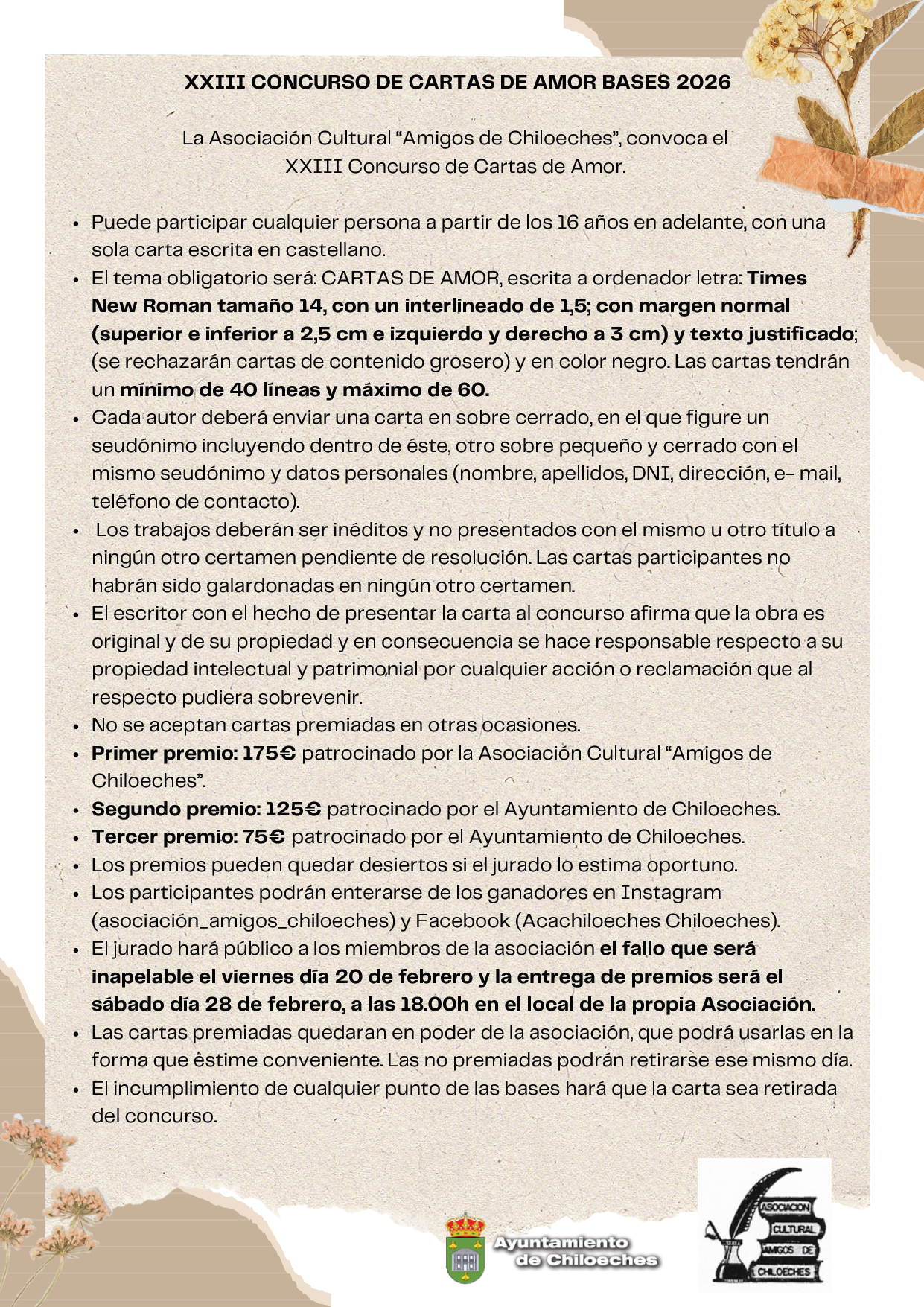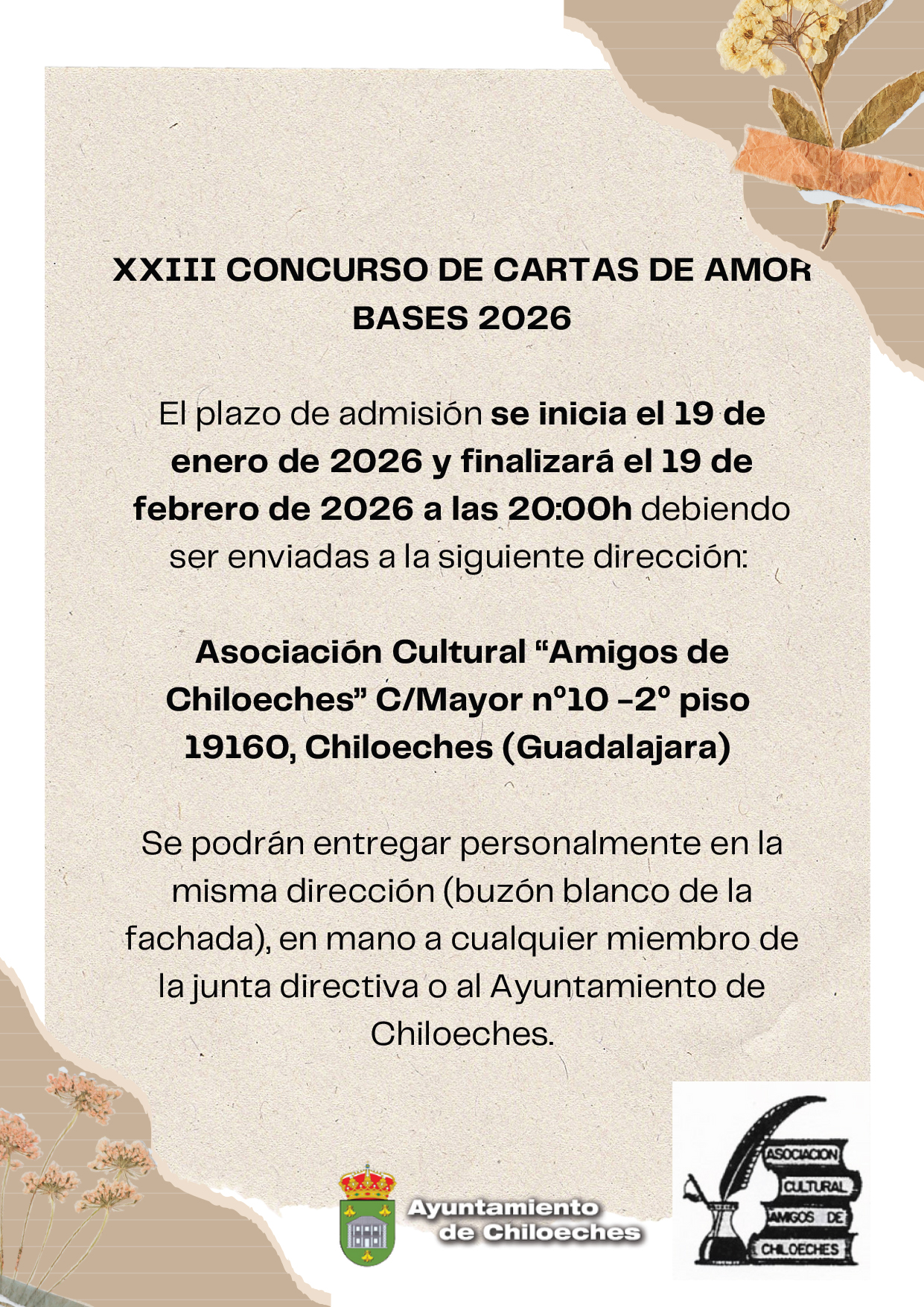 Asociación Cultural “Amigos de Chiloeches” C/ Mayor nº10 - 2º piso. 19160, Chiloeches (Guadalajara).¡No dejes pasar la oportunidad de expresar lo que sientes y ganar uno de los premios!