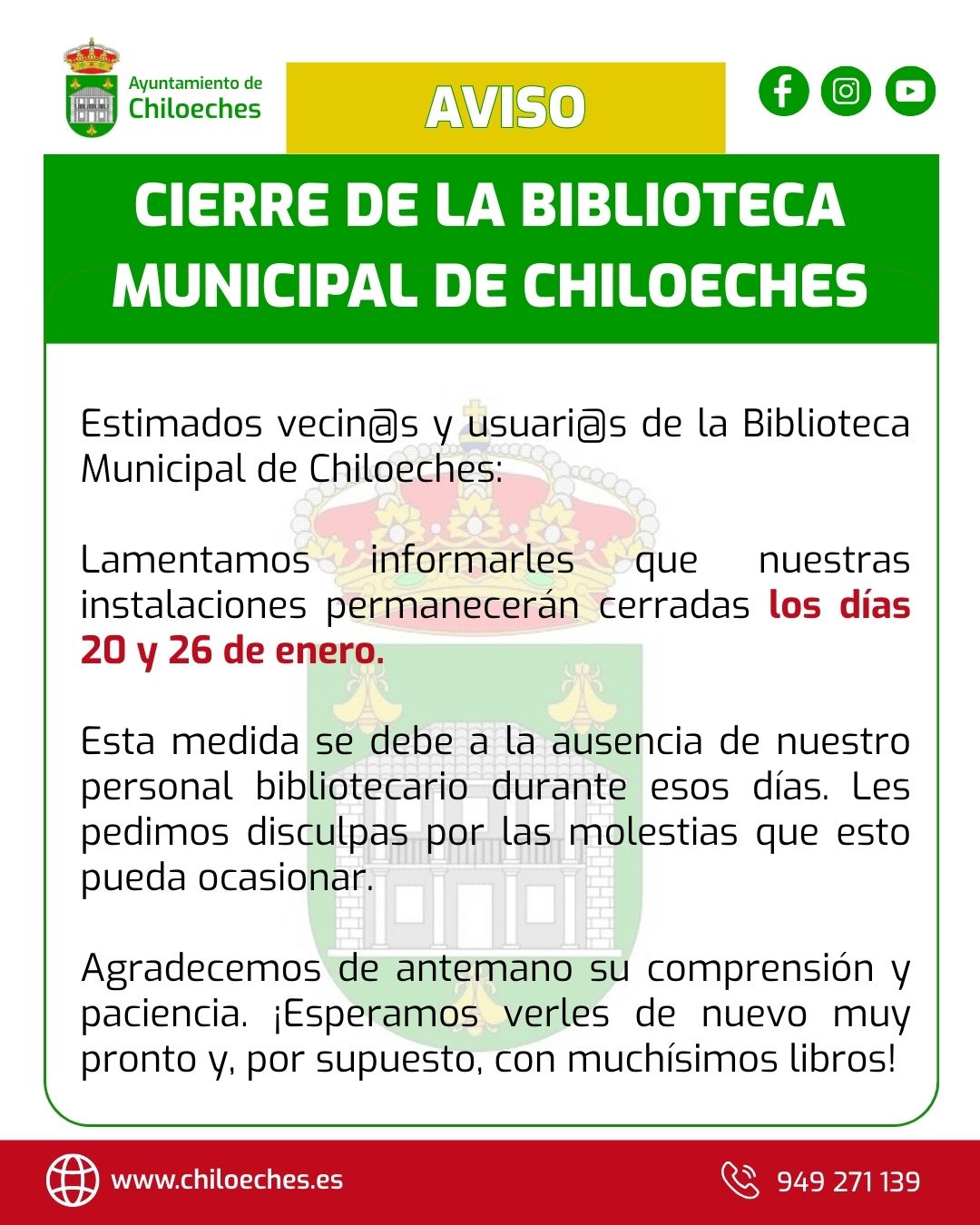 Estimados vecin@s y usuari@s de la Biblioteca Municipal de Chiloeches: