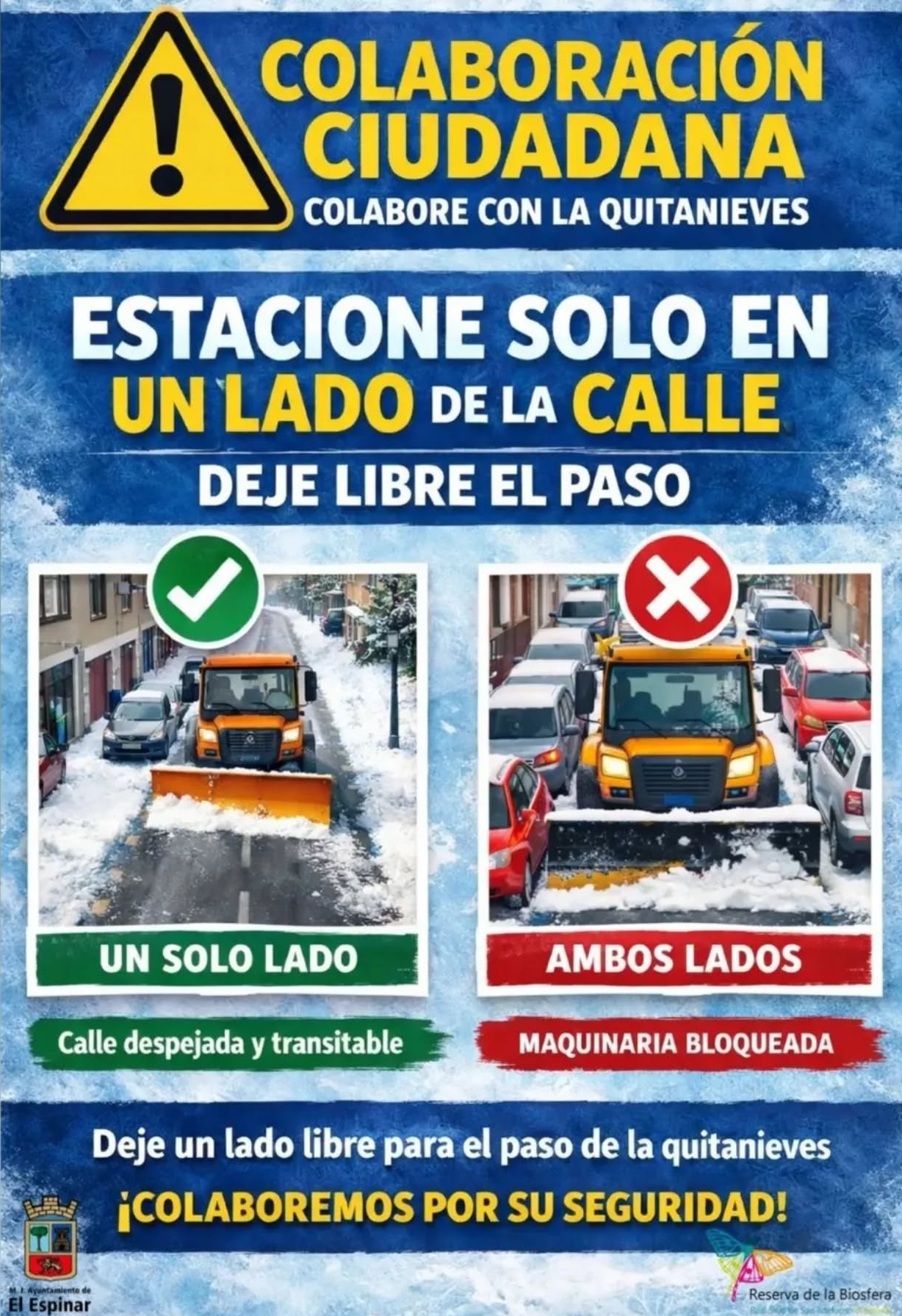 Se informa a la población que las labores de limpieza de nieve y el esparcido de sal se están viendo seriamente dificultadas debido al estacionamiento de vehículos a ambos lados de la calzada en diversas vías del municipio.
