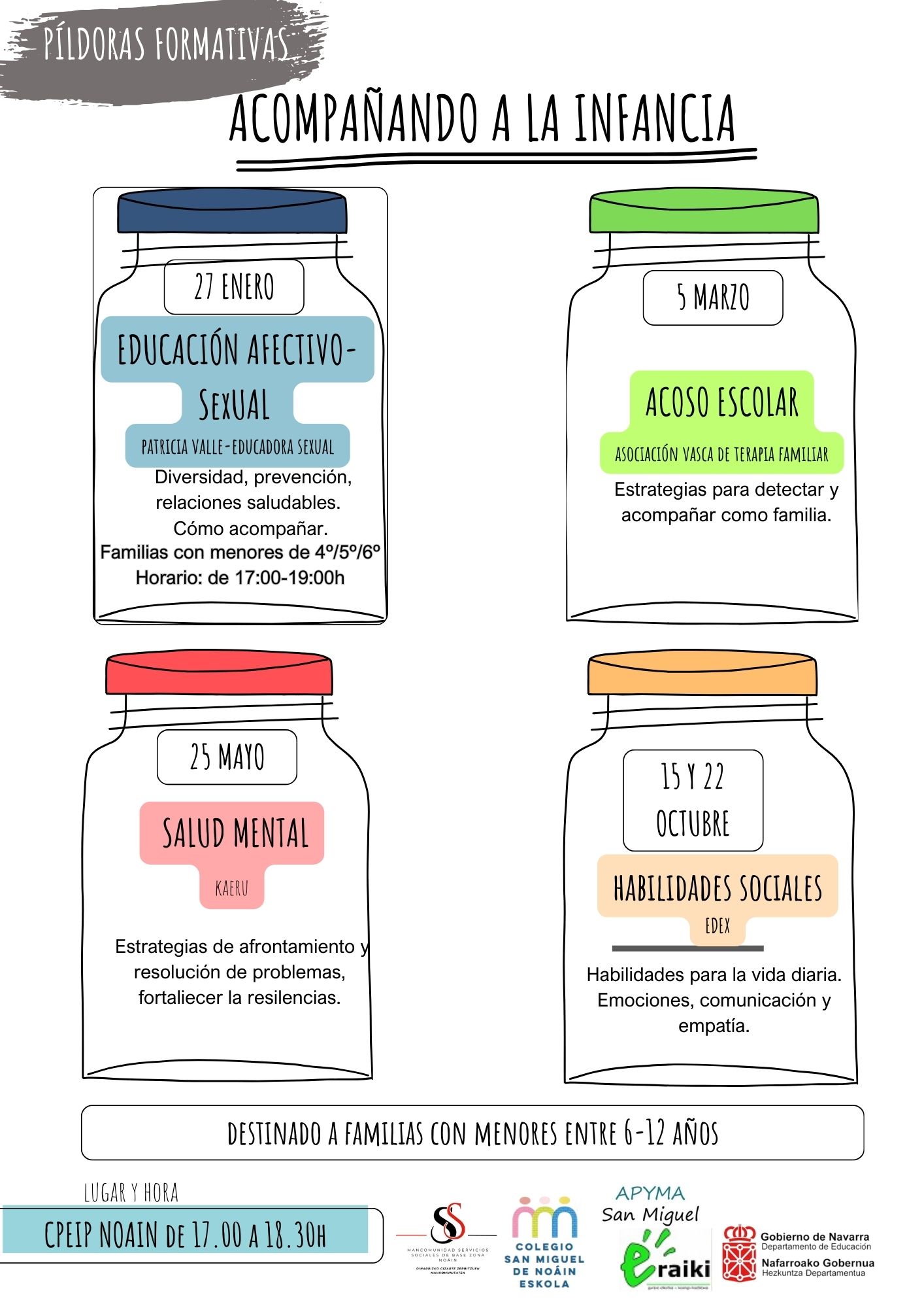 El Programa de Infancia y Familia de la Mancomunidad de Servicios sociales de la zona de Noáin retomará a partir de este mes de enero el proyecto de la “Escuela de Familias” – Acompañando a la Infancia “que consistirá en un ciclo de 4 píldoras formativas que se realizaran a lo largo del 2026 impartidas por profesionales especializados externos que colaboran con la Mancomunidad de Servicios sociales de Noáin.