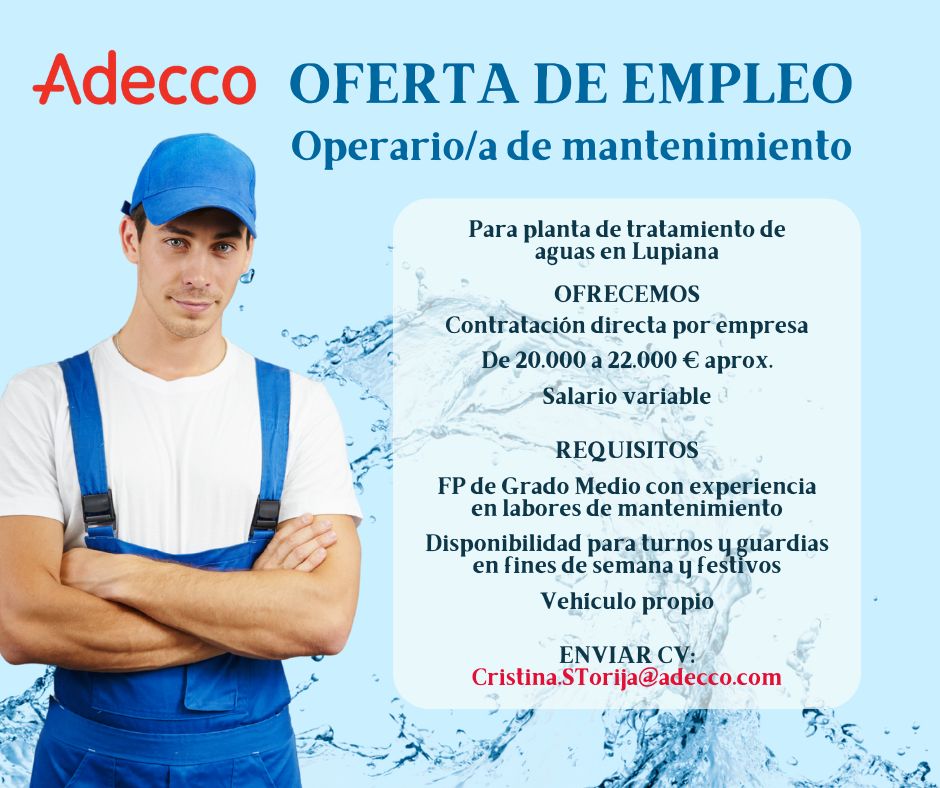 Adecco Selección necesita incorporar un/a operario/a de mantenimiento de planta de tratamiento de aguas ubicada en Lupiana para gestionar el mantenimiento básico y supervisión de la planta, así como del servicio a municipios cercanos.