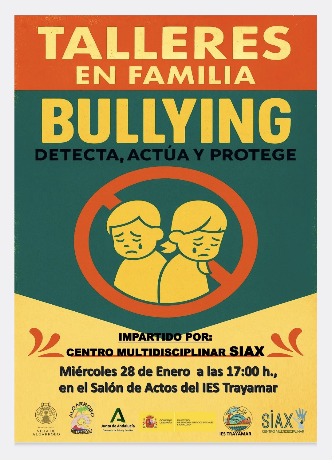 El Ayuntamiento de Algarrobo, dentro del programa “Algarrobo ante las drogas”, subvencionado por la Consejería de Salud y Consumo de la Junta de Andalucía, organiza el taller: 🛑 BULLYING: DETECTA, ACTÚA Y PROTEGE 🛡️