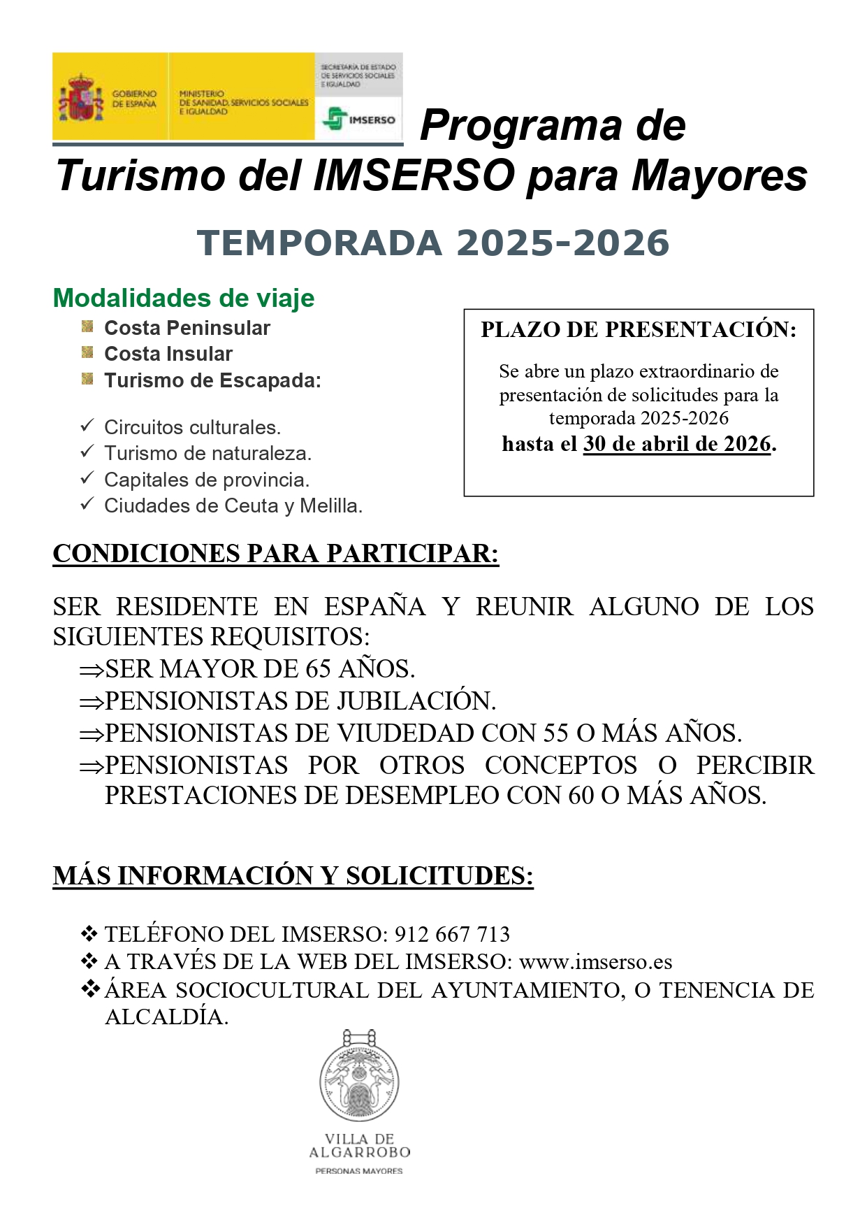 ¡Atención! Ampliado el plazo de solicitud Se ha ampliado el plazo para presentar la solicitud del Programa de Turismo del IMSERSO 🧳✈️ 🗓️ Hasta el 30 de abril
