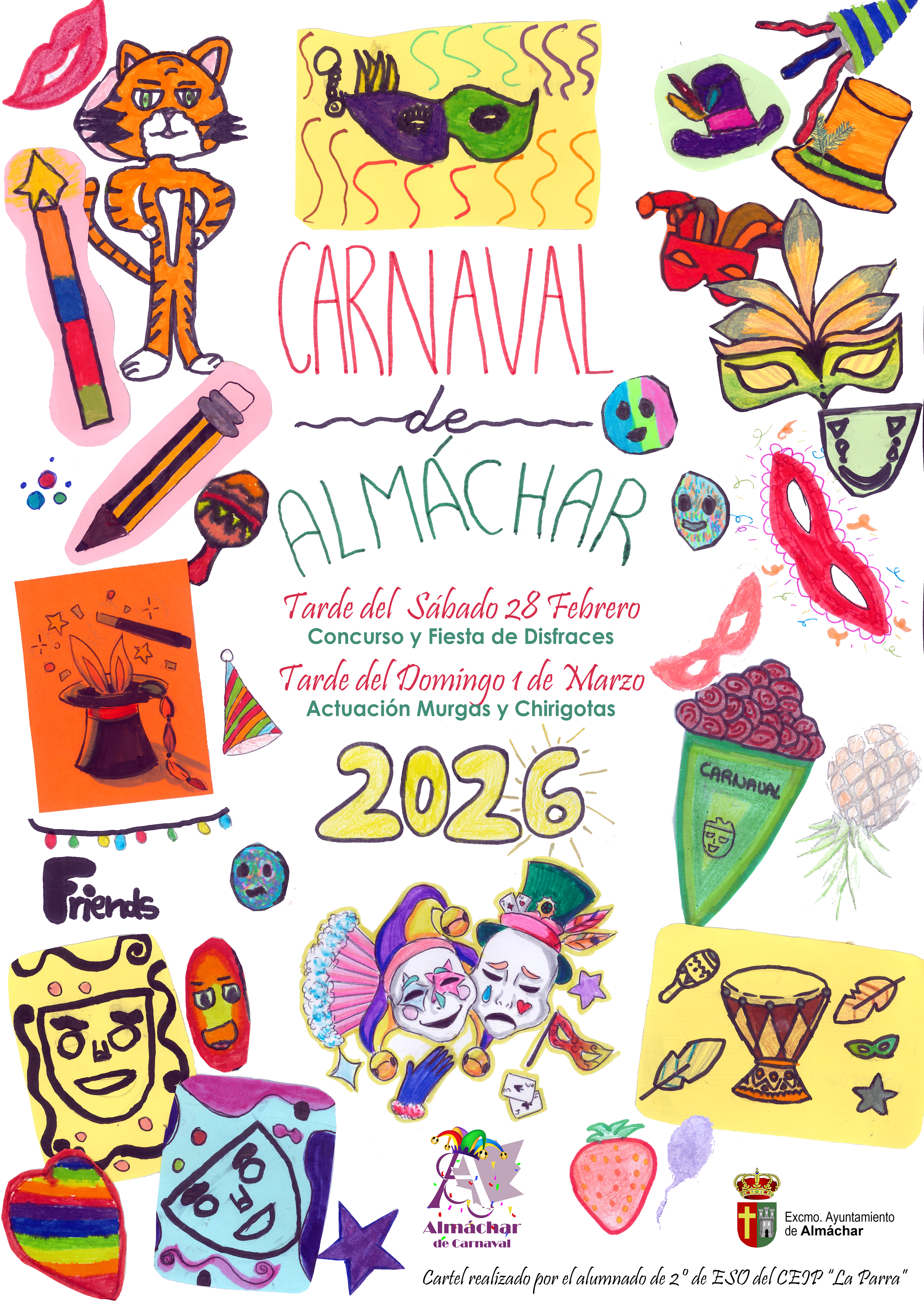Os presentamos el cartel del Carnaval de Almáchar 2026, una celebración llena de color, creatividad y alegría, realizada por el alumnado de 2º de ESO del CEIP “La Parra”.