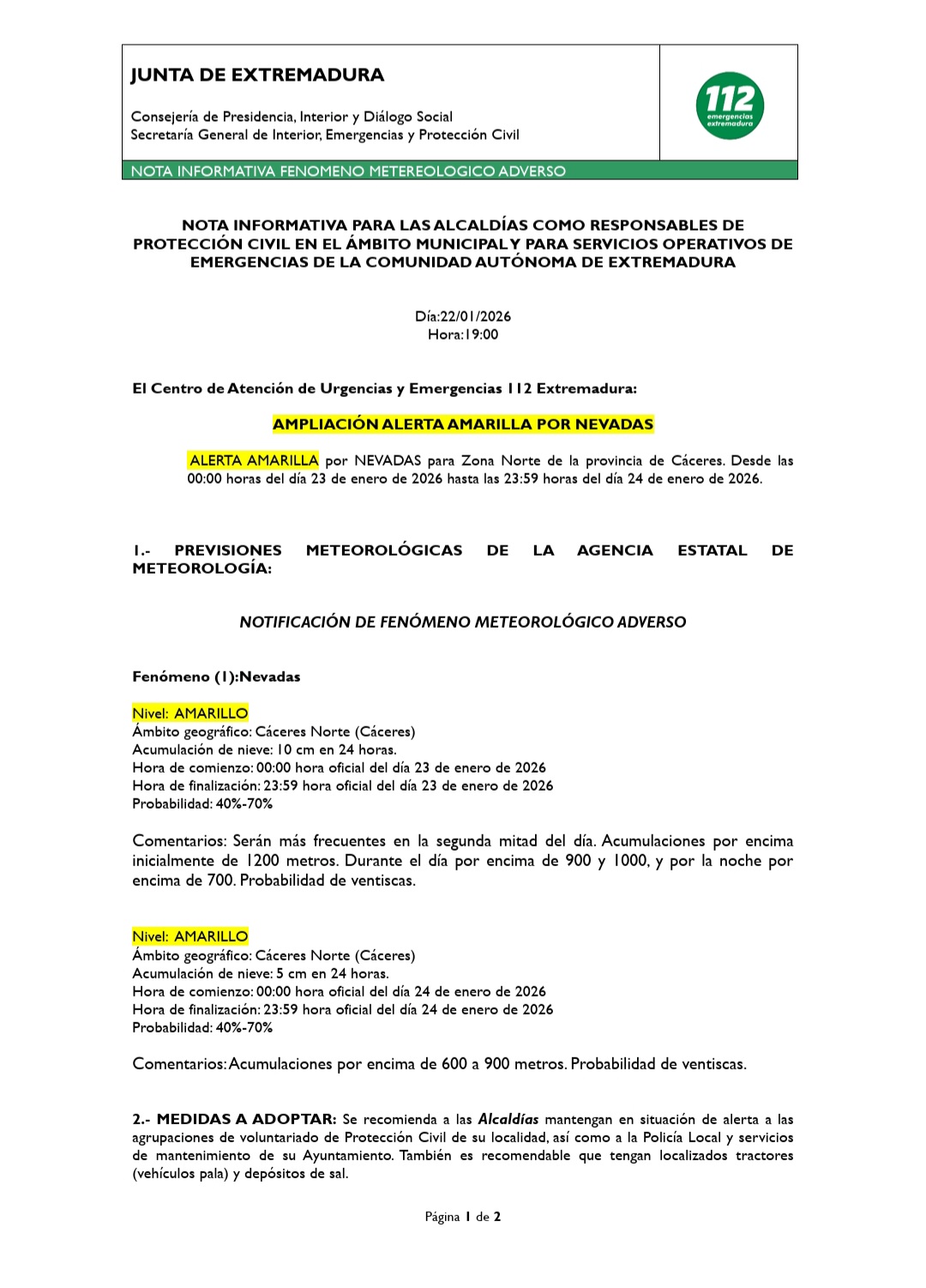 - Motivo: previsión de nevadas