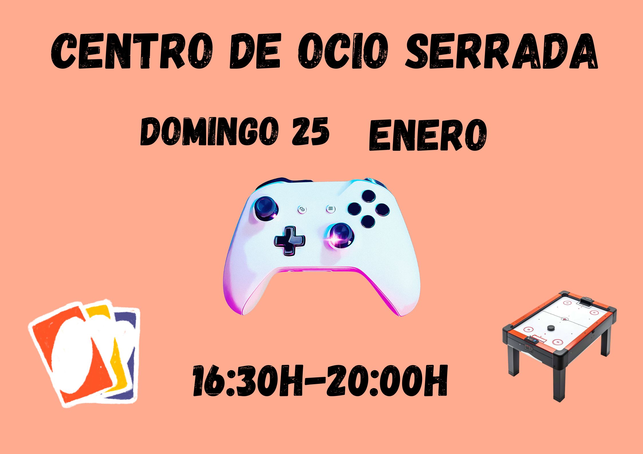 Este domingo 25 de Enero abrimos el centro de ocio. Recordamos que es para mayores de 10 aƱos.Horario de apertura en el cartel adjunto.
