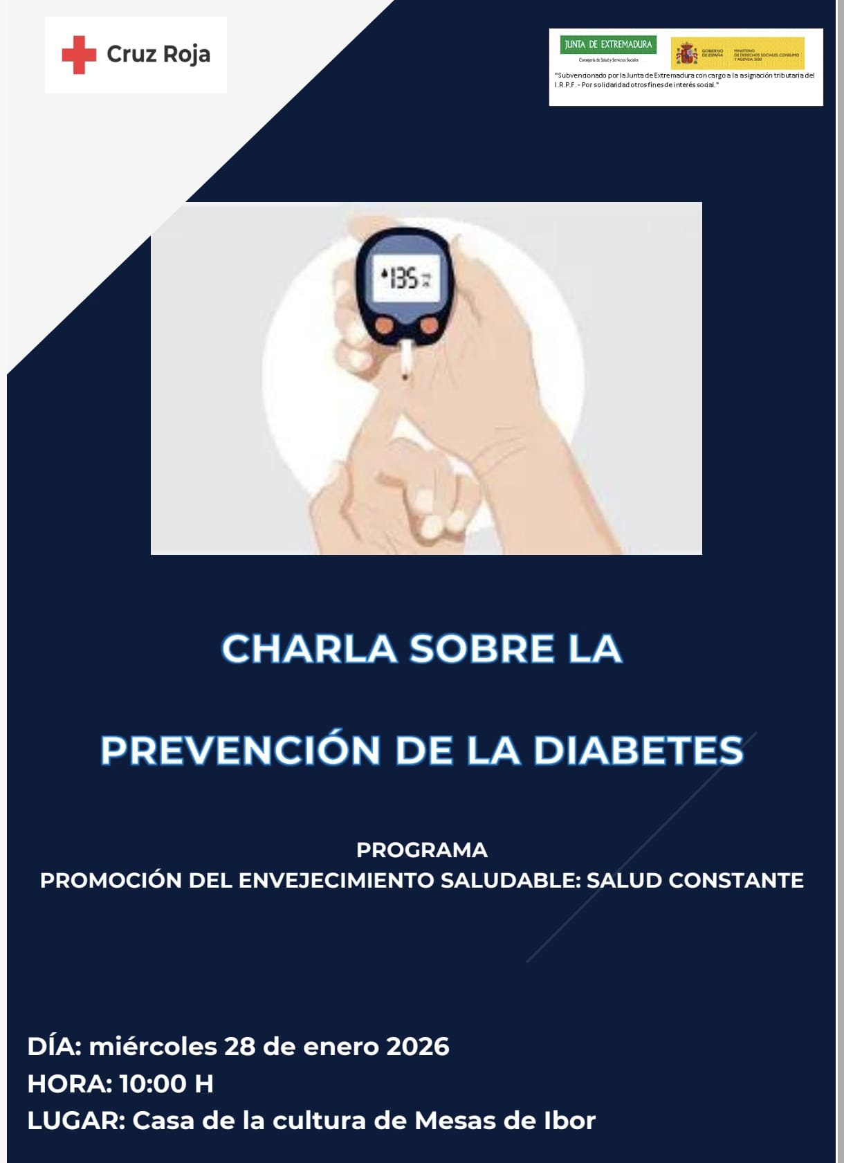 Charla sobre la prevención de la diabetes impartida por Cruz Roja. Día: 28 de eneroHora: 10:00 Lugar: casa de la cultura