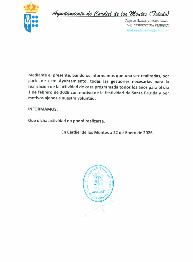 Mediante el presente bando os informamos, que una vez realiadas, por parte de este Ayuntamiento, todas las gestiones necesarias par la realización de la actividad de caza, programada todos los años para el día 1 de febrero de 2026, con motivo de la festividad de Santa Brígida y por motivos ajenos a nuestra voluntad,