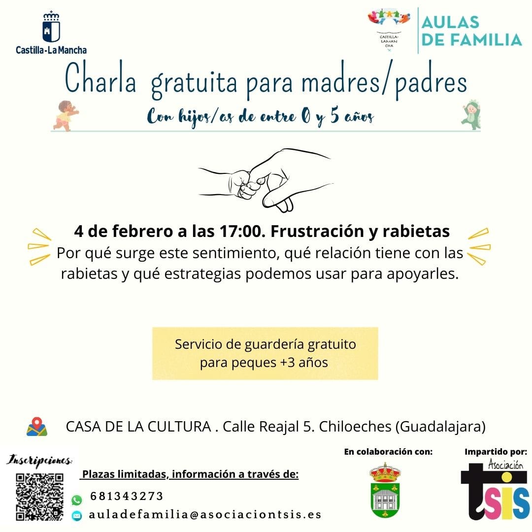 Aulas de Familia Guadalajara ha organizado, en colaboración con el Ayuntamiento de Chiloeches, un encuentro diseñado para apoyar en la crianza de los hijos bajo el título 'Frustración y rabietas' en el que se abordarán aspectos como el por qué surge este sentimiento, qué relación tiene con las rabietas y qué estrategias se pueden aplicar.