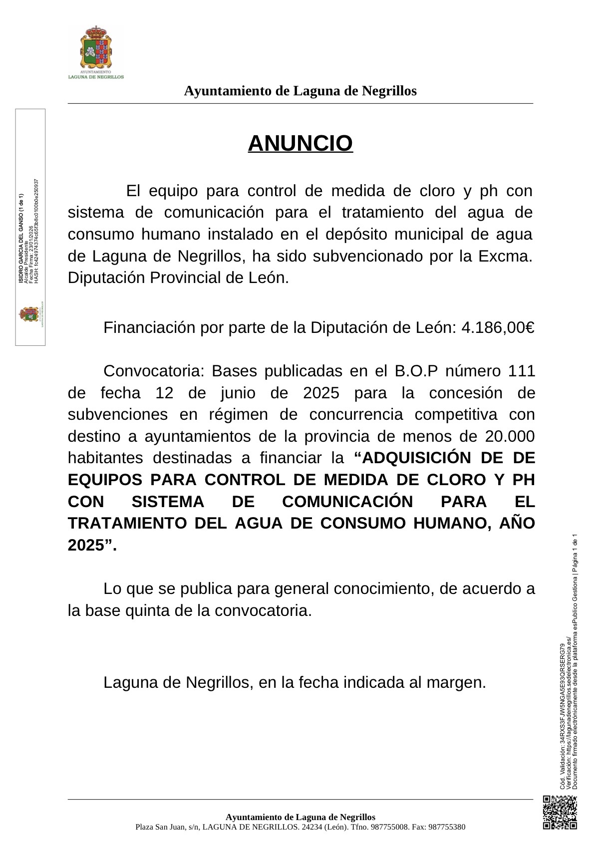 Vista publicada la subvención para la adquisición de equipos de cloro y pH convocada por la Diputación de León, el Ayuntamiento de Laguna de Negrillos procedió a solicitar el pasado mes de julio de 2025, un nuevo equipo para el depósito de agua potable debido al desgaste del equipo actual por el paso de los años.