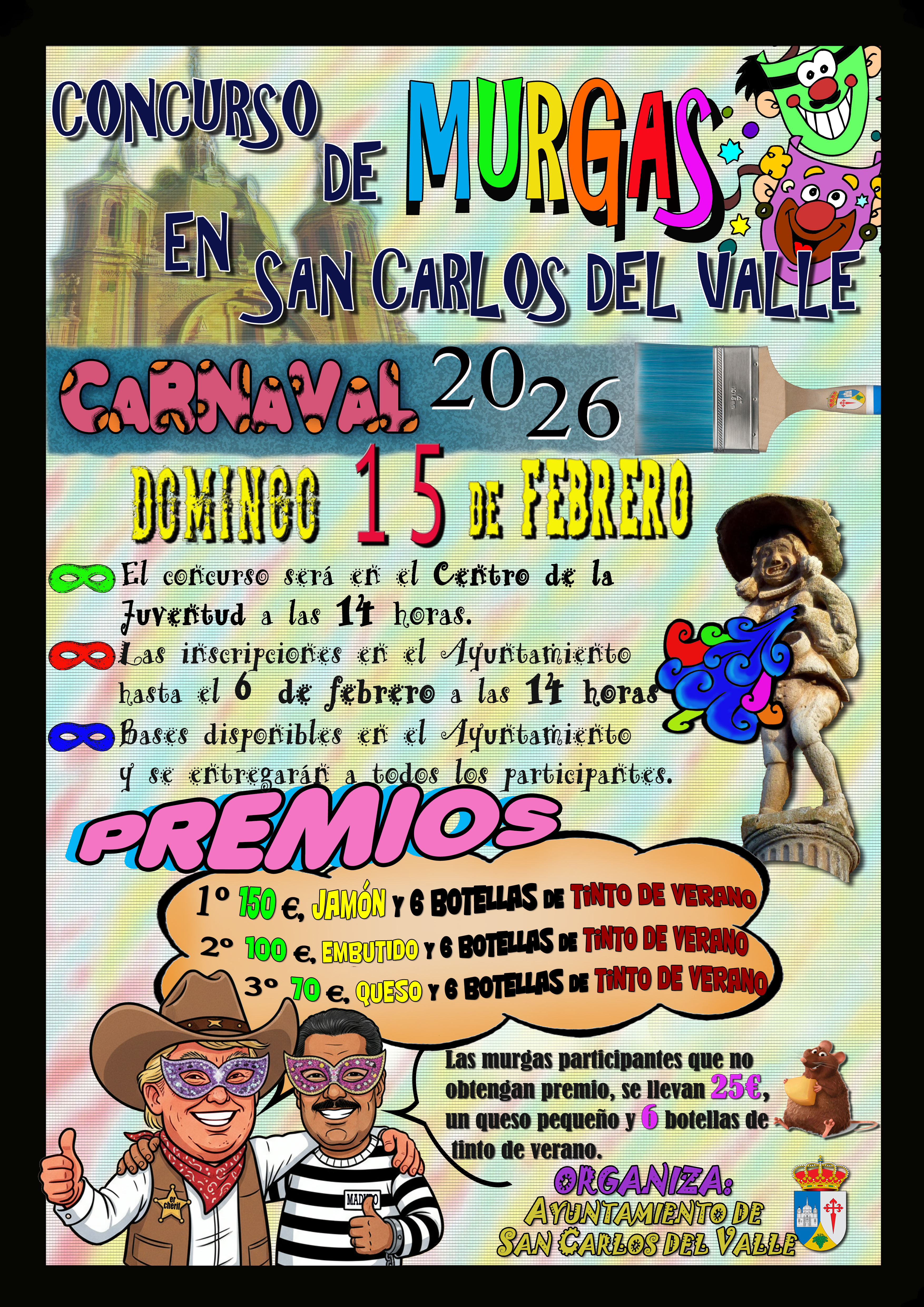 La Concejalía de Festejos organiza el Concurso de Murgas 2026, que se celebrará el domingo 15 de febrero a las 14h en el Centro de La Juventud. Las inscripciones se realizarán en el Ayuntamiento hasta las 14h del viernes 6 de febrero.