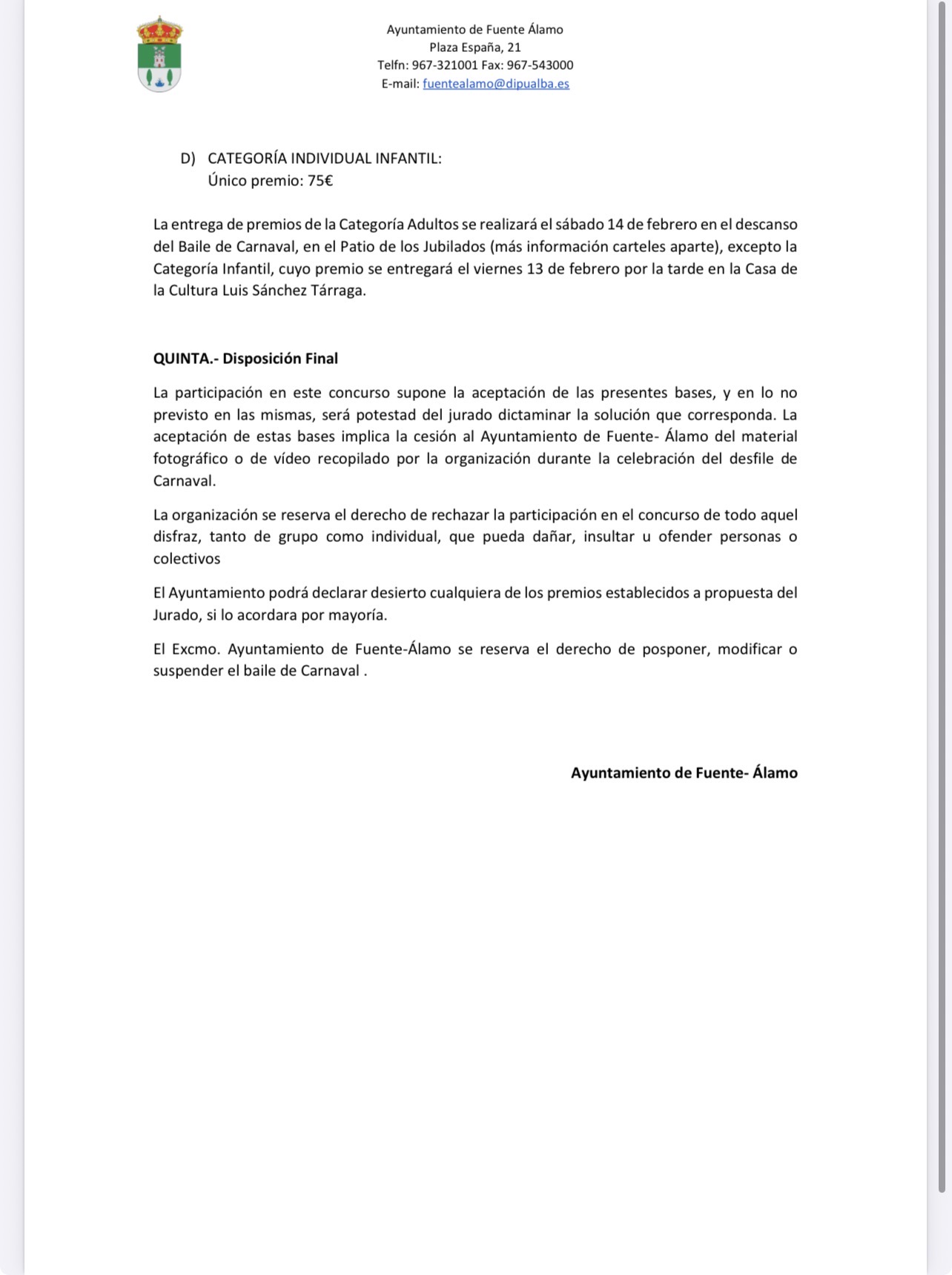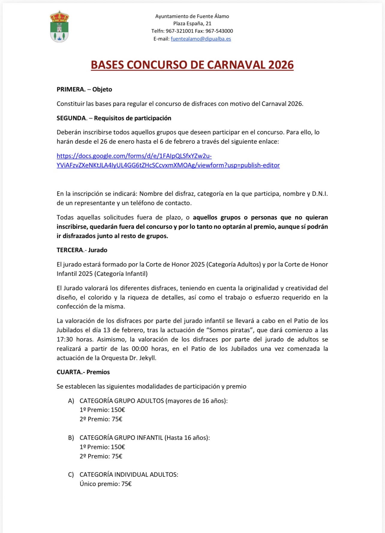 🎭Os dejamos las bases y carteles de los actos que tendrán lugar este carnaval 2026, tanto infantil como de adultos.