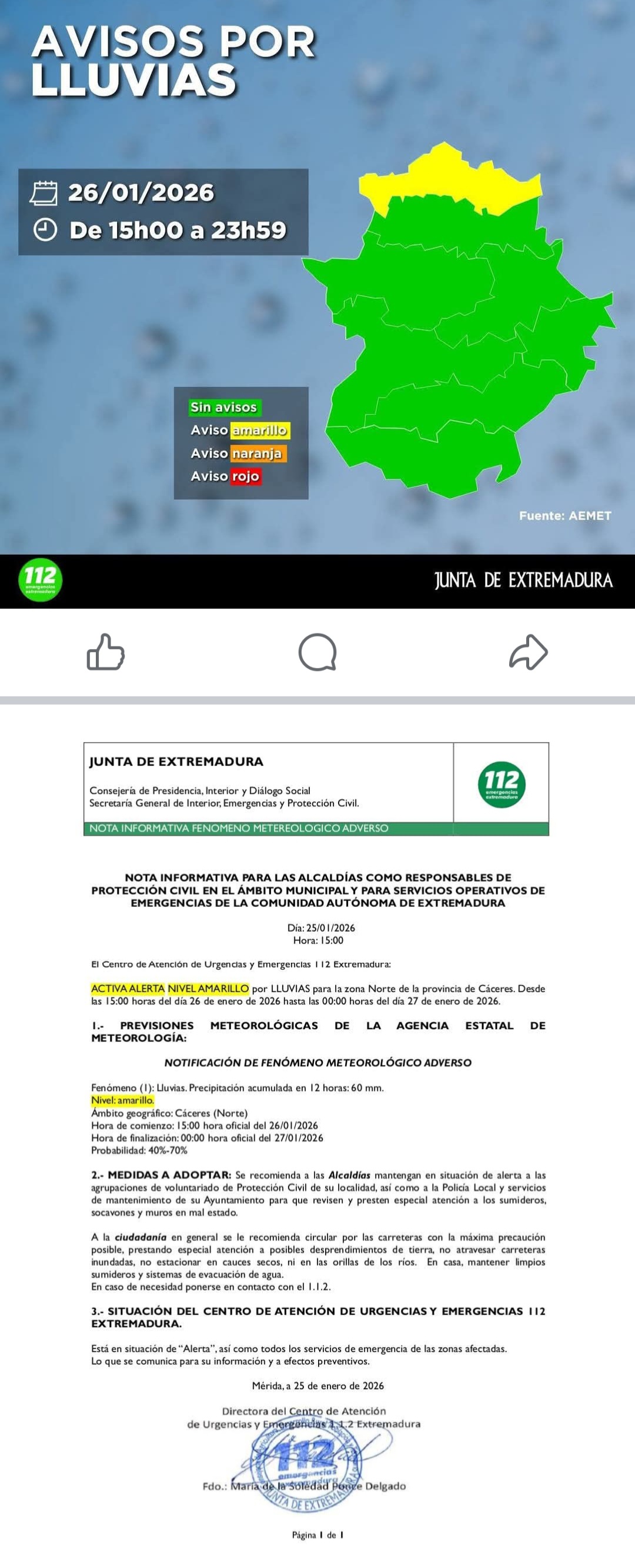 🚨⚠️ 🚨 🗣️Atención ALERTA AMARILLA 🟡🟡🟡 por Lluvia ☔️ en el norte de la provincia de Cáceres.