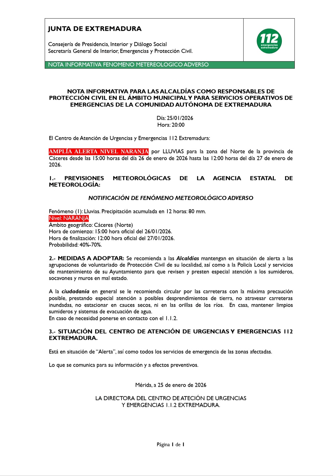 🚨⚠️ 🚨 🗣️Atención ALERTA NARANJA por Lluvia ☔️ en el norte de la provincia de Cáceres.