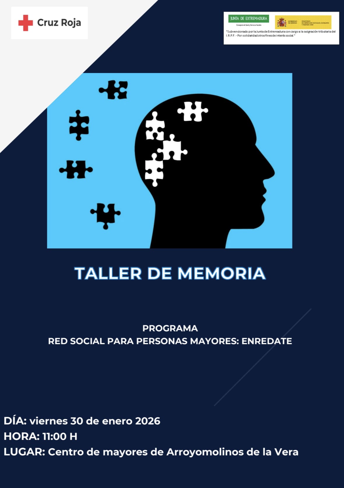 El viernes 30 de enero a las 11:00 habrĂ¡ un taller de memoria de Cruz Roja en el centro de mayores.