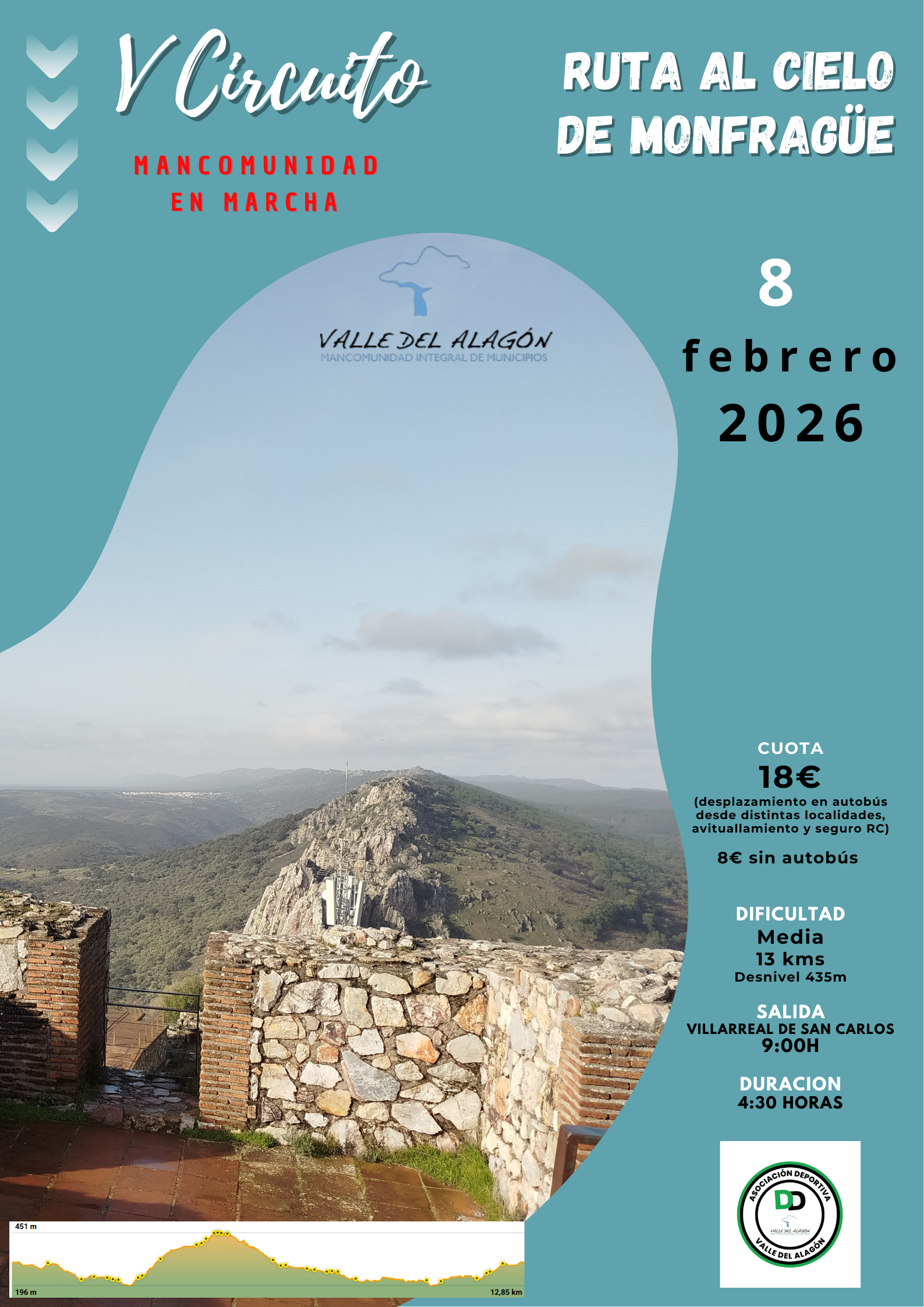 En esta ocasión nos desplazaremos a Villarreal de San Carlos donde el día 8 de febrero recorreremos una ruta de 13km cuyo nombre es "Ruta al Cielo de Monfragüe".