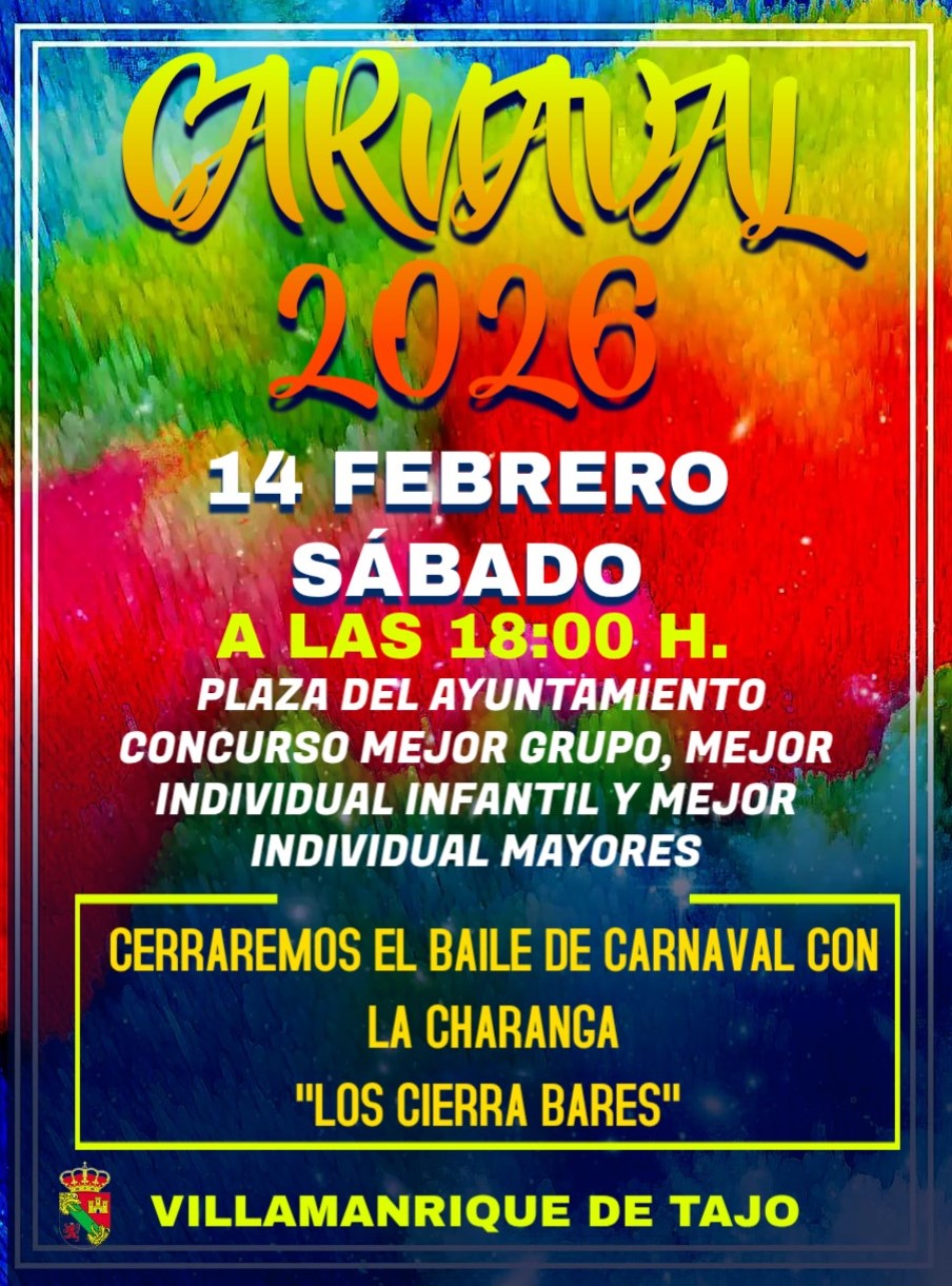 Carnavales 2026 Villamanrique de Tajo.Sábado 14 de Febrero a las 18:00 horas en la Plaza del Ayuntamiento.Habrá premios al mejor grupo, mejor disfraz individual infantil y mejor disfraz individual mayores.