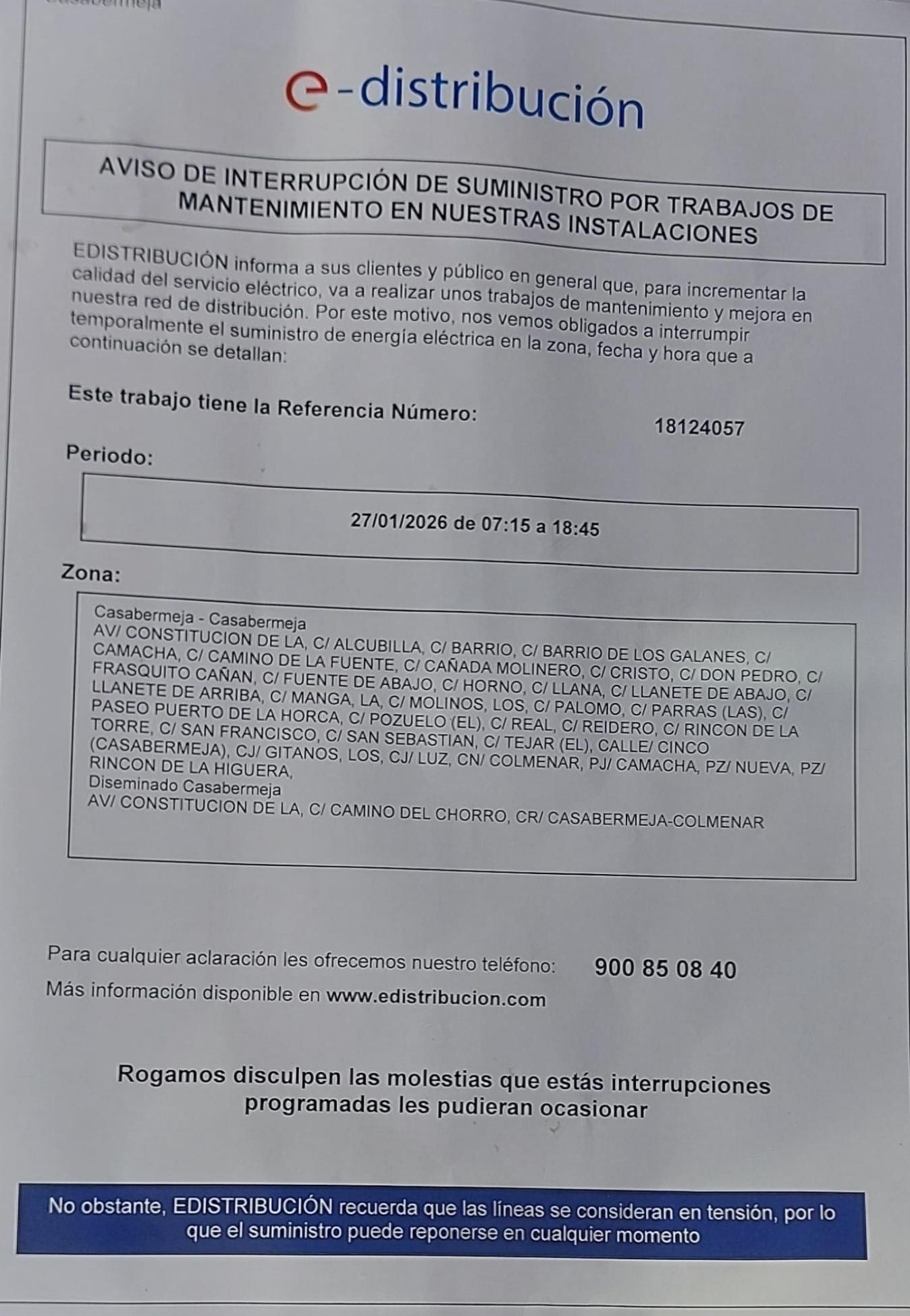 ℹ️ Para incidencias o información directa: 📞 900 85 08 40 (E-Distribución)