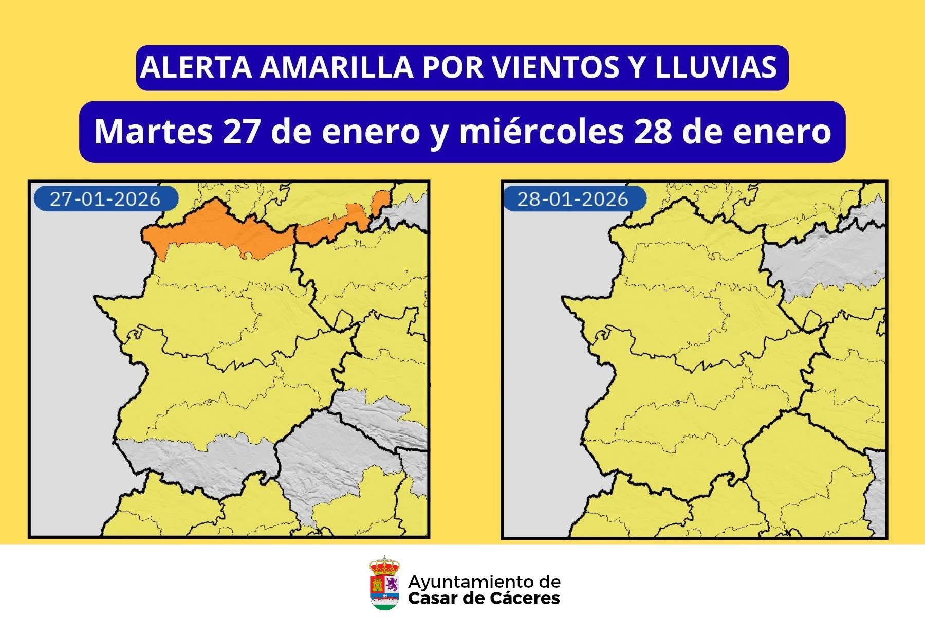 ⚠️ El Centro de Atención de Urgencias y Emergencias 112 de Extremadura ha activado la ALERTA AMARILLA por rachas de vientos que pueden alcanzar los 70 km/h y lluvias en nuestra zona, la Meseta Cacereña, y parte de la región, a excepción del norte de Extremadura que continua en alerta naranja.