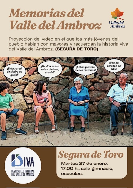 SE INFORMA A TODOS LOS VECINOS QUE MAÑANA 27 DE ENERO DE 2026, EN EL GIMNASIO DE LAS ESCUELAS A LAS 17:00 HORAS SE PROYECTA EL VIDEO MEMORIAS DEL AMBROZ, EN EL QUE LOS NIÑOS ENTREVISTAN A NUESTROS MAYORES DE SEGURA DE TORO