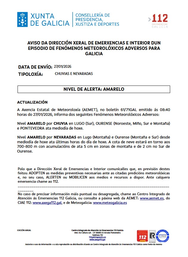 A Axencia Estatal de Meteoroloxía (AEMET), no boletín 61/71GAL emitido ás 08:40 horas do 27/01/2026, informa dos seguintes Fenómenos Meteorolóxicos Adversos: