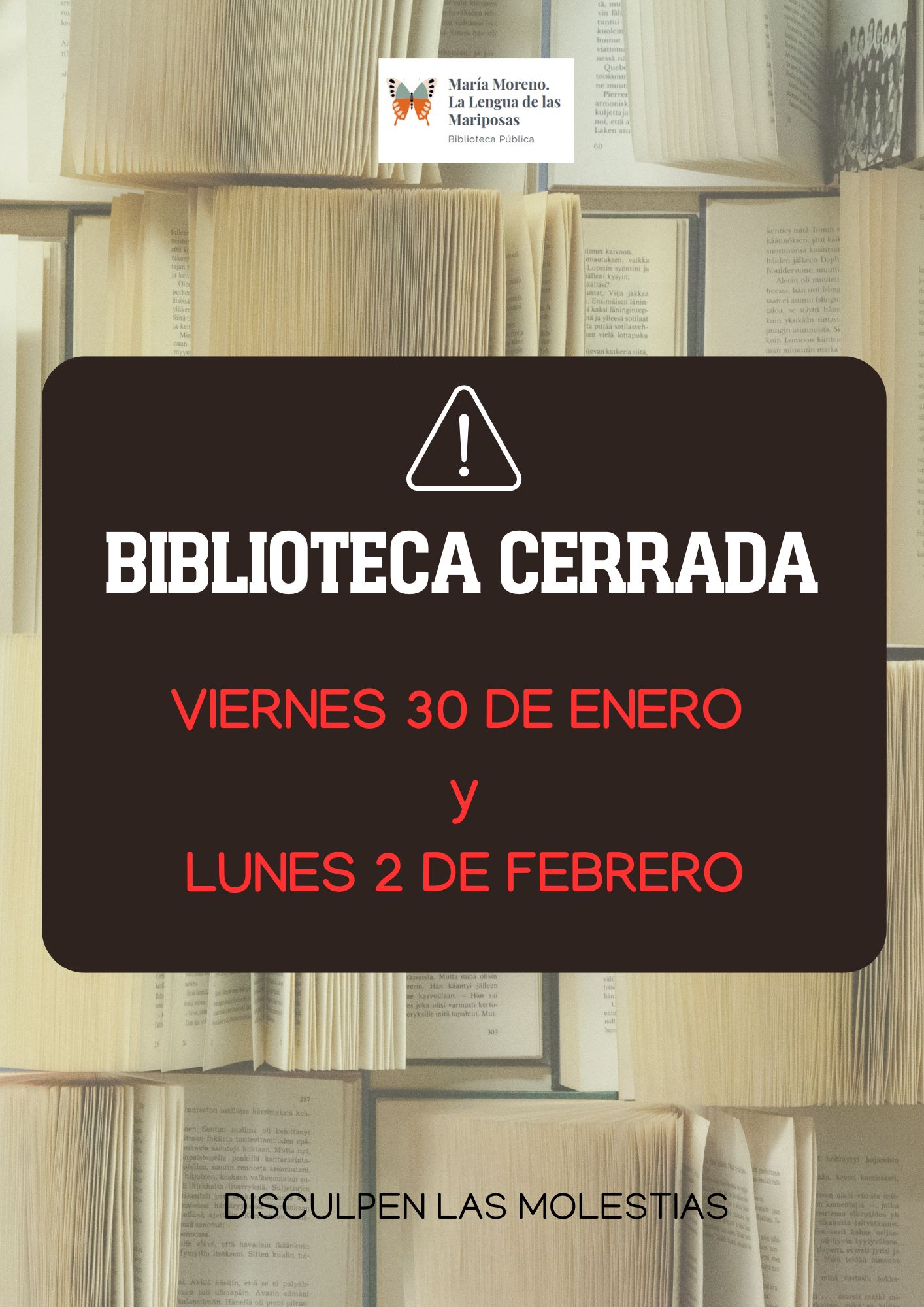 La Biblioteca María Moreno "La Lengua de las Mariposas" cerrará los días viernes 30 de enero y lunes 2 de febrero. Disculpen las molestias.