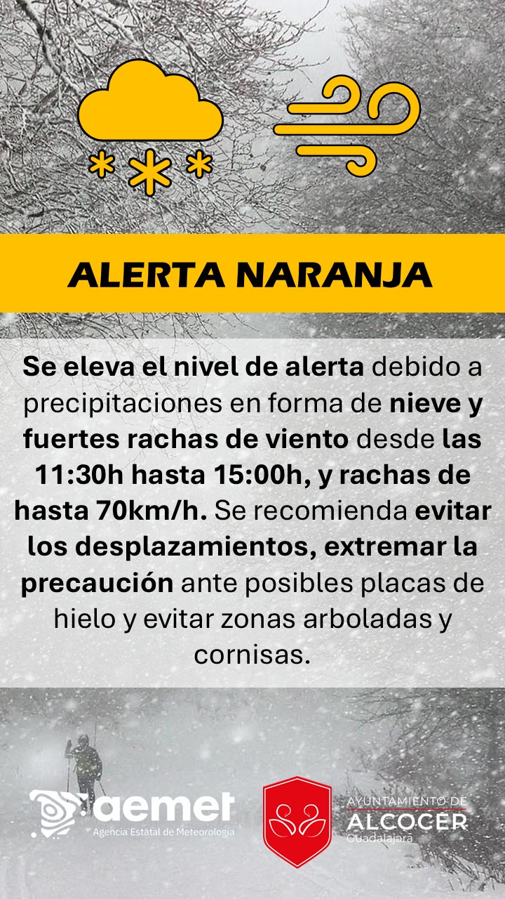 🟠 ALERTA NARANJA |Se eleva el nivel de alerta debido a precipitaciones en forma de nieve y fuertes rachas de viento desde las 11:30h hasta 15:00h, y rachas de hasta 70km/h. Se recomienda evitar los desplazamientos, extremar la precaución ante posibles placas de hielo y evitar zonas arboladas y cornisas.