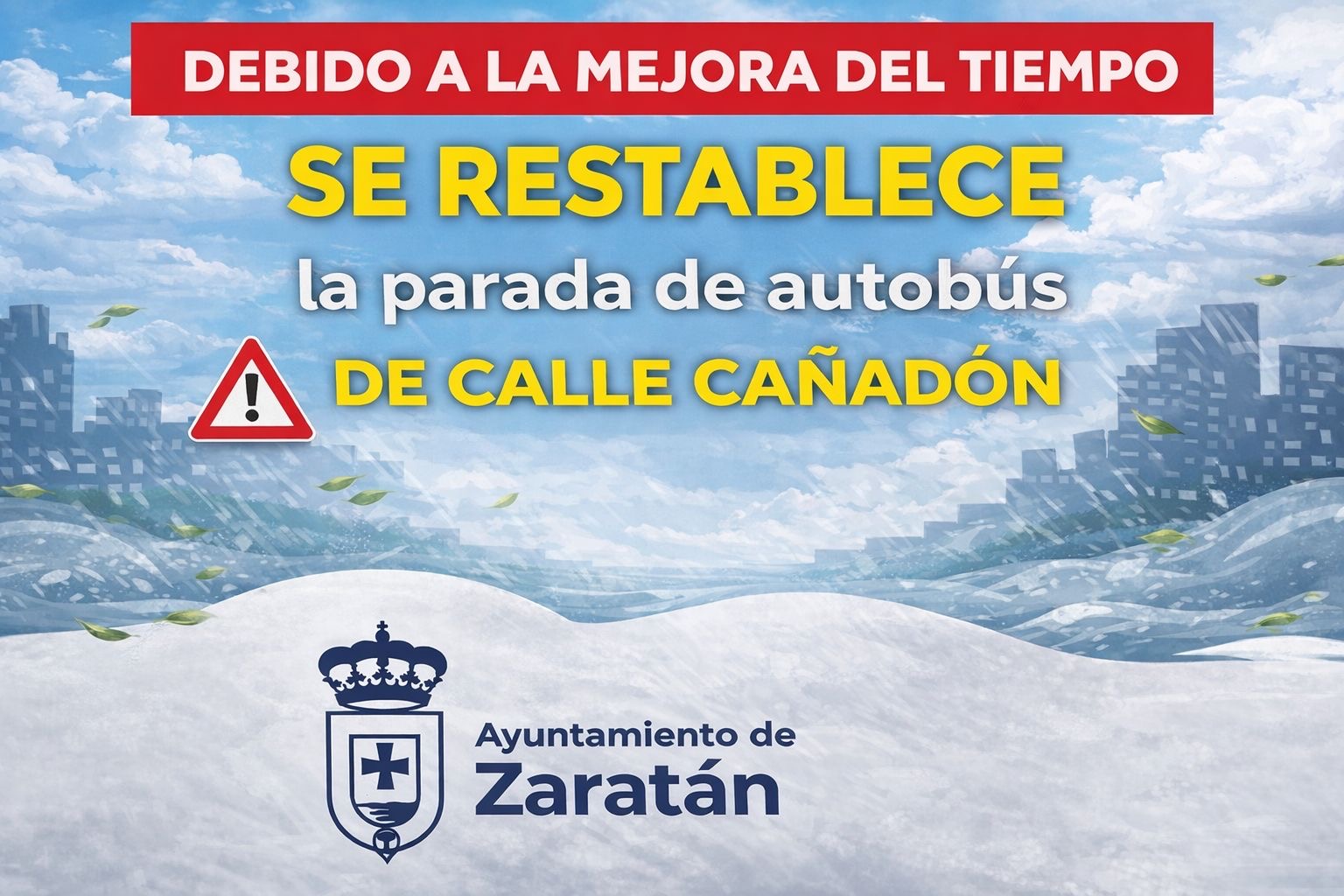 Debido a la mejora de las condiciones meteorol贸gicas, SE RESTABLECE el servicio y SE REACTIVA la parada de autob煤s de la calle Ca帽ad贸n con normalidad.