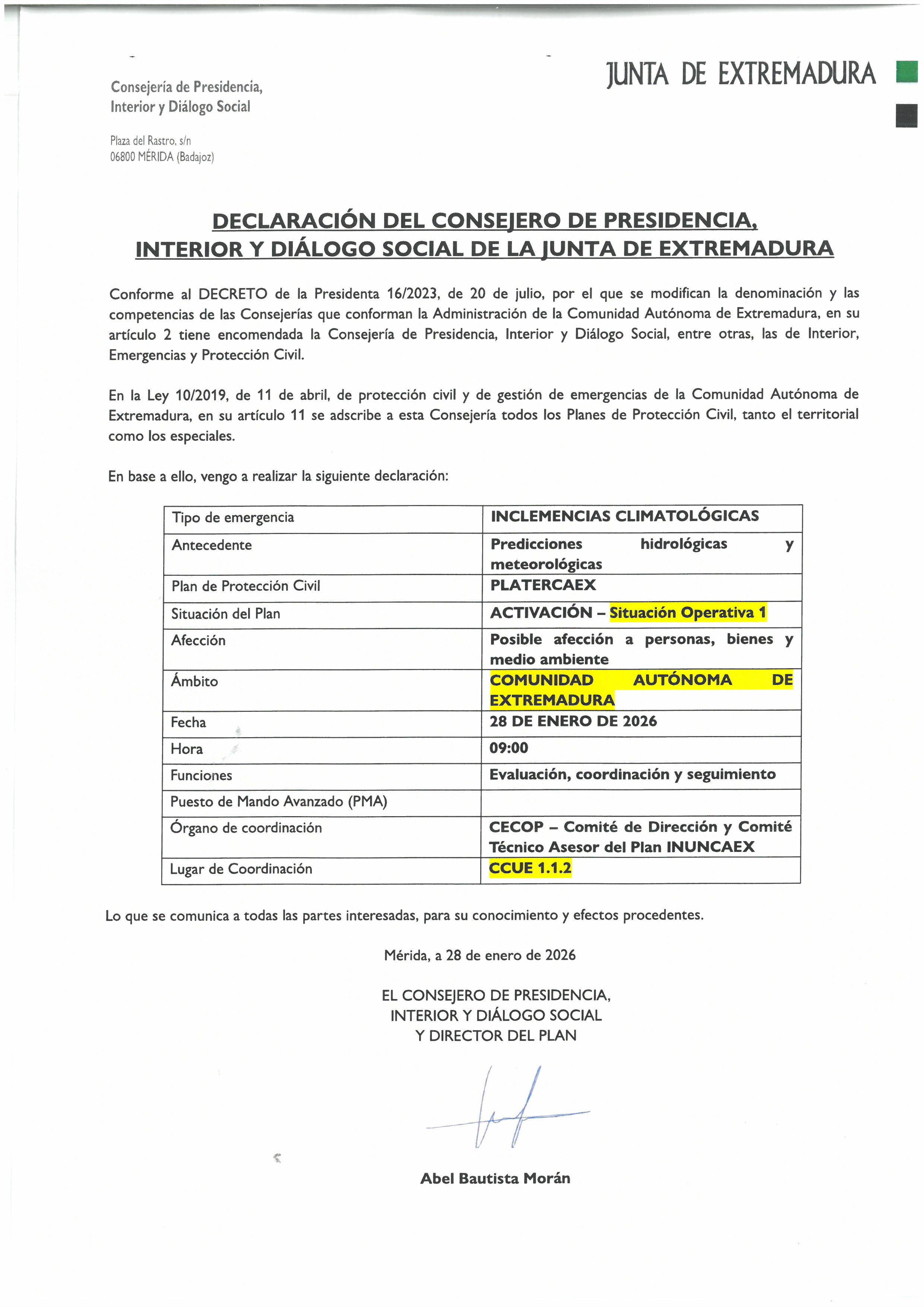 La Junta de Extremadura ha activado el plan PLATERCAEX en situación operativa 1 debido a inclemencias meteorológicas. El Ayuntamiento informa a la población para que adopte precauciones y siga las indicaciones de los servicios de emergencia.