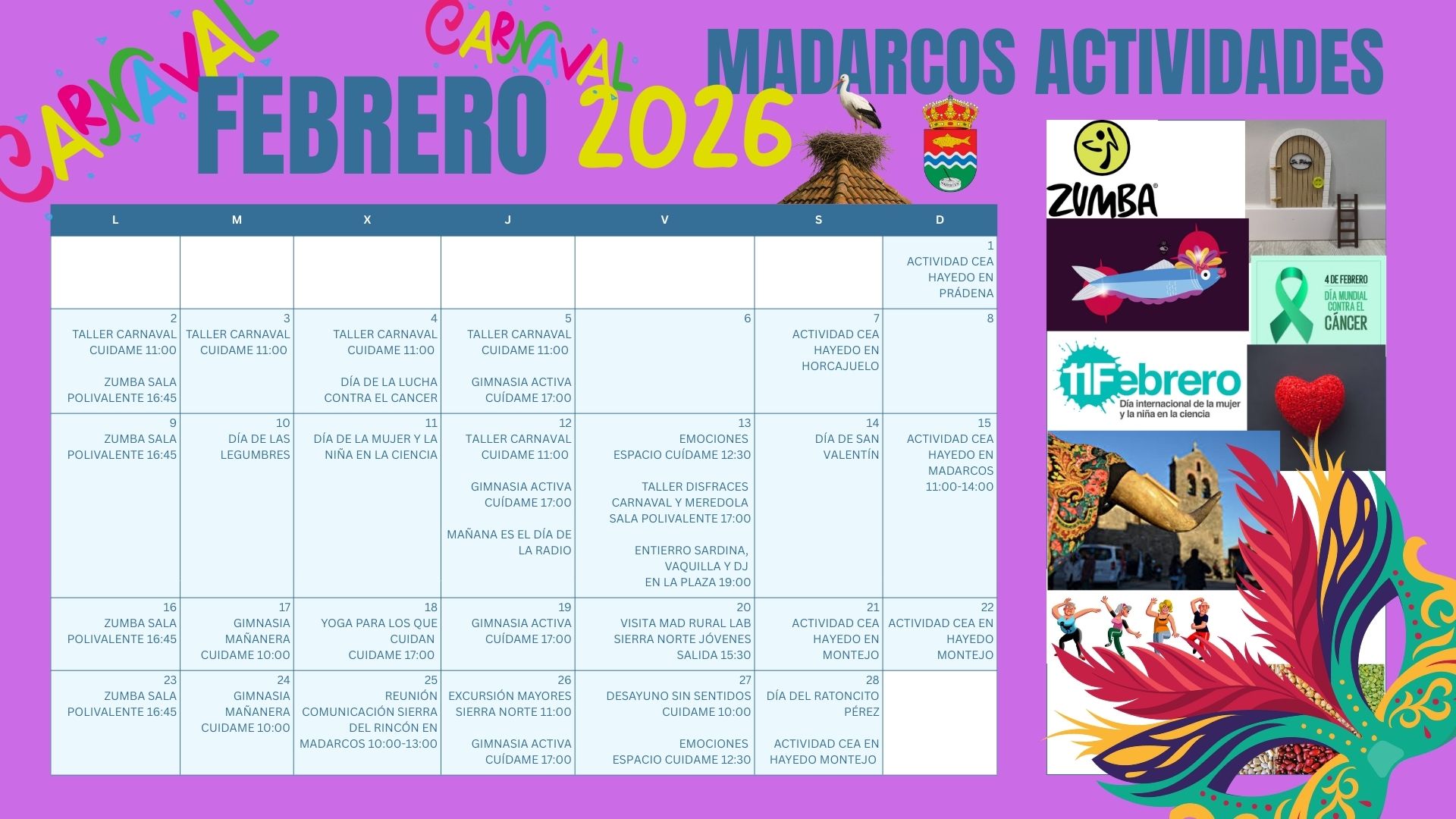 Se publica el calendario de actividades para febrero de 2026. El programa incluye la celebración del Carnaval, con la corrida de las vaquillas, un desayuno comunitario y actividades fÃsicas y de ocio para disfrutar de la sierra.