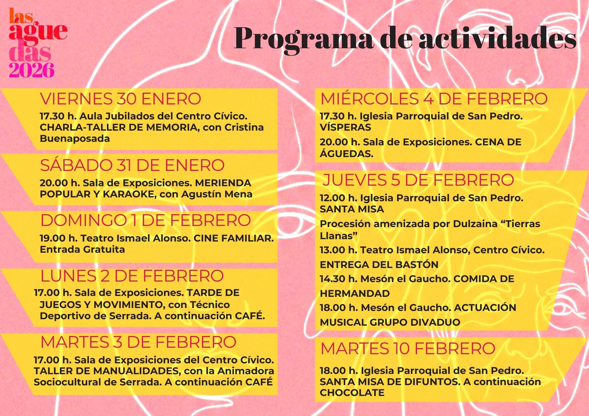 A continuación os dejamos el programa de actividades que han organizado las Águedas en colaboración con el Ayuntamiento y vecinos de Serrada.