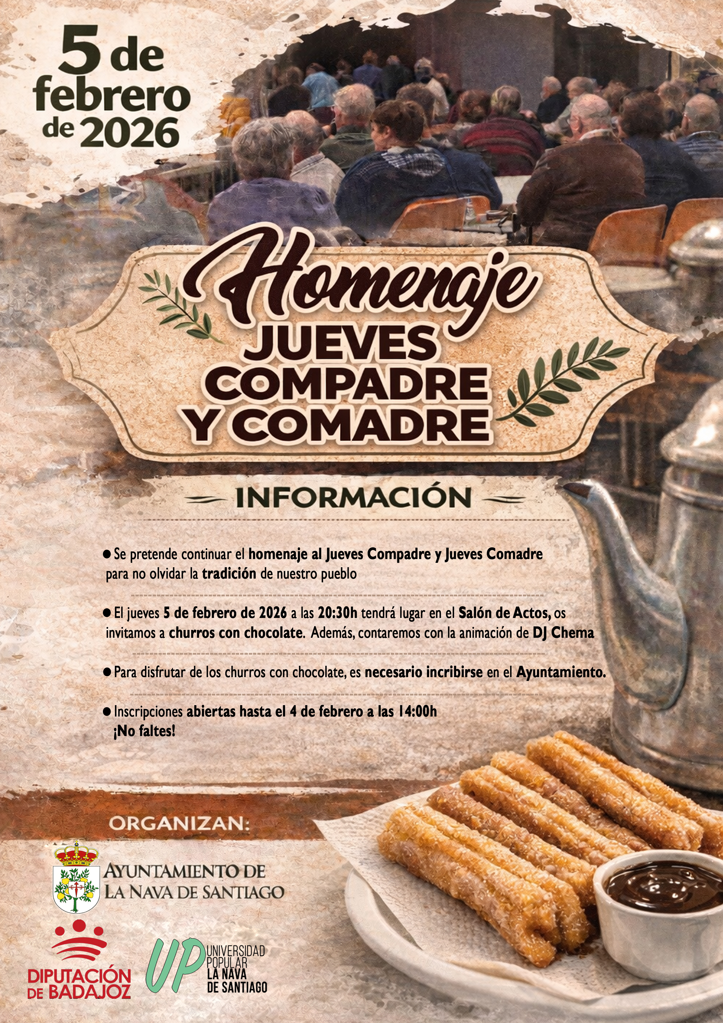 INVITACIÓN HOMENAJE AL JUEVES COMPADRE El próximo día 5 de febrero, tendrá lugar en el salón de acto a las 20:30h el Homenaje al Jueves Compadre, donde se invitará a churros con chocolate. Además, la noche estará amenizada por DJ CHEMA.