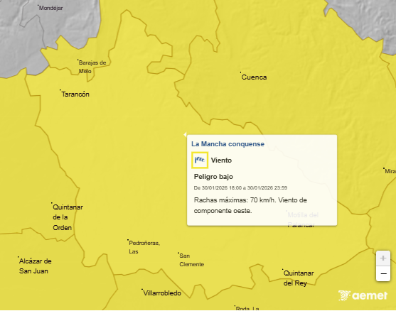 La Agencia Estatal de Meteorología (AEMET), ha activado desde las 18:00H hasta las 00:00H de mañana viernes 30 de enero, el aviso de nivel amarillo por fuertes vientos (Rachas máximas de hasta 70 km/h) en la Mancha Conquense.