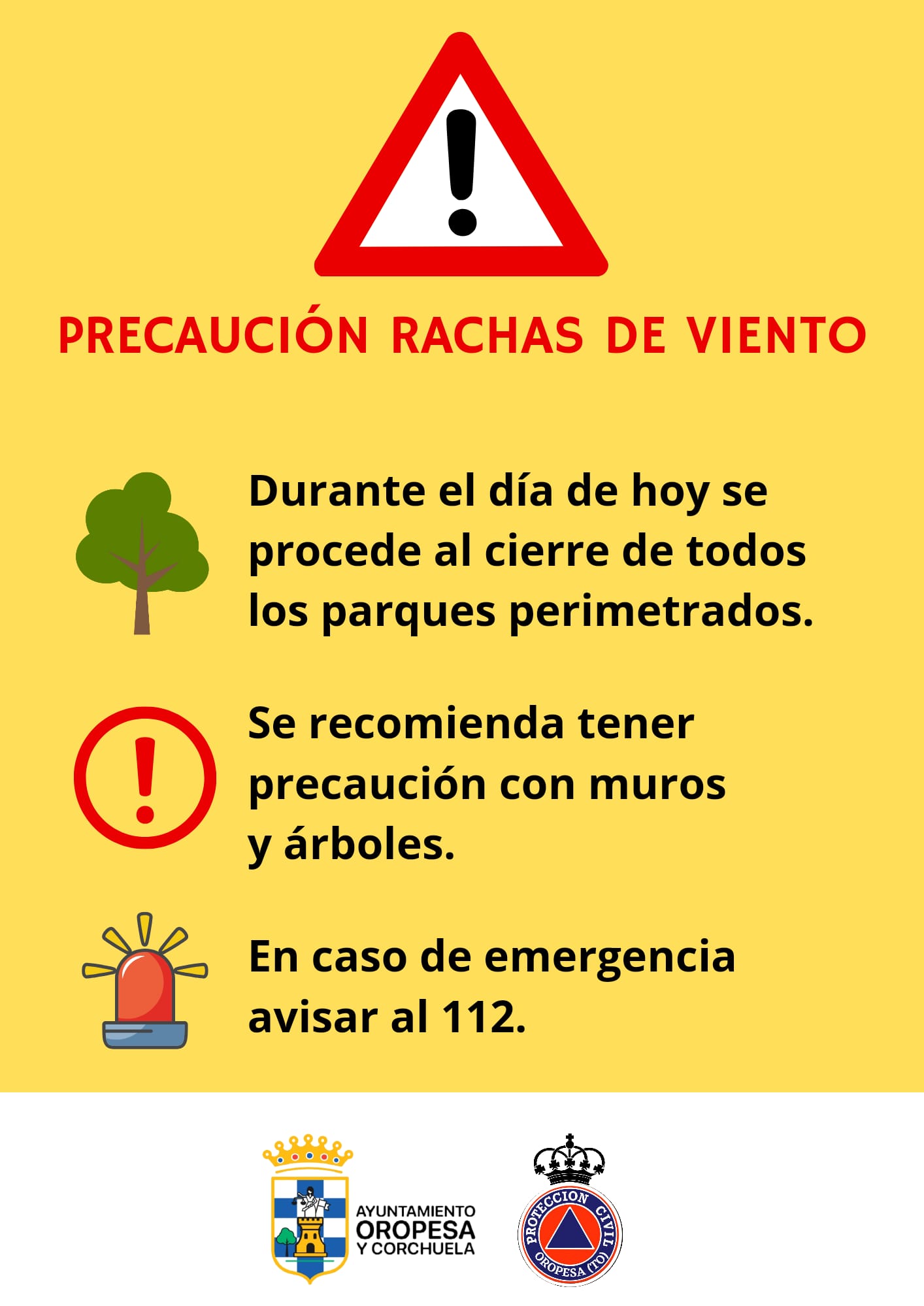 🌬️Precaución por rachas de viento. 🔒Se mantiene el cierre de todos los Parques perimetrados. ⛔🌳 Se recomienda tener precaución con muros y árboles. 🏥🚑 En caso de emergencia avisar al 112.
