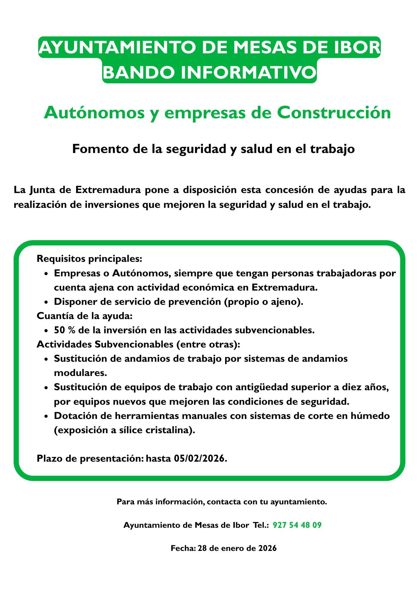 La junta de Extremadura pone a disposición esta concesión de ayudas para la realización de inversiones que mejoren la seguridad y salud en el trabajo dirigida a autónomos y empresas del sector de la construcción.