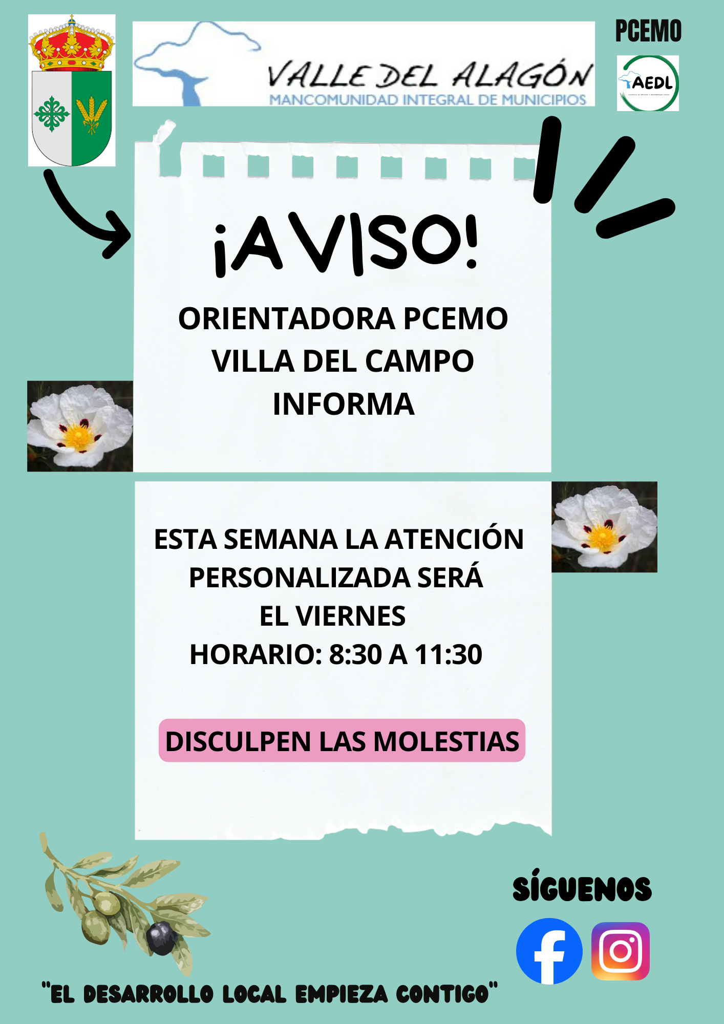 Se informa que el horario de la orientadora PCEMO de esta semana, la atención personalizada será el viernes 6 de febrero en horario 8:30 a 11:30 horas.