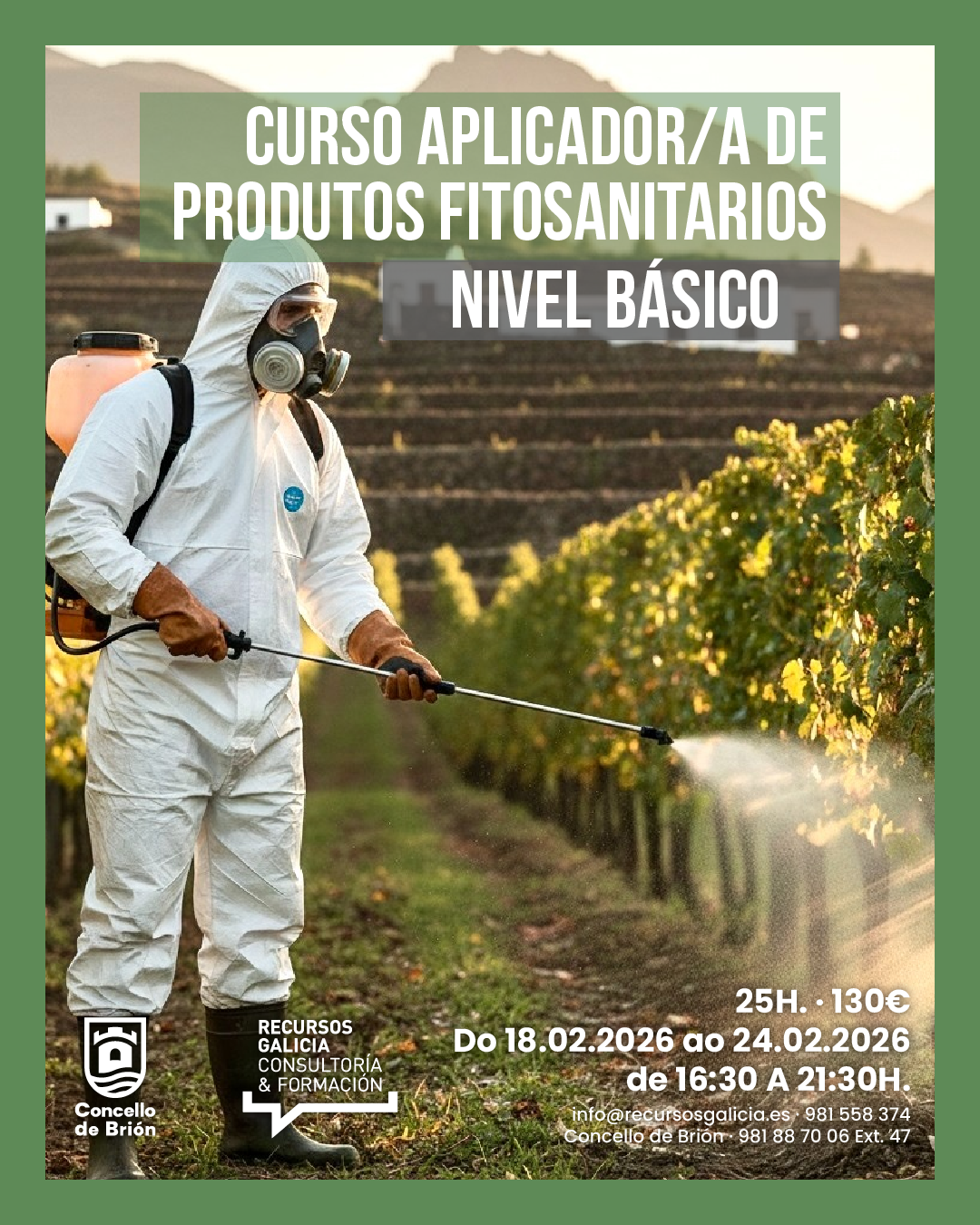 O Concello de Brión organiza unha nova edición do curso de aplicador/a de produtos fitosanitarios (nivel básico), formación obrigatoria para o uso profesional destes produtos segundo a normativa vixente.