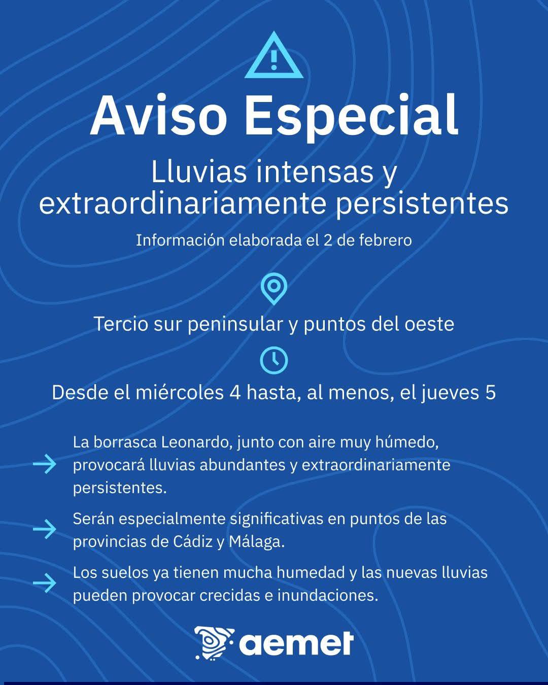 Según AEMET, este episodio afectará especialmente al tercio sur peninsular, con acumulaciones muy importantes, riesgo de inundaciones, deslizamientos de tierra, rachas de viento muy fuertes y temporal marítimo. El miércoles 4 será el día de mayor adversidad, pudiendo superarse los 200–250 l/m² en 24 horas en puntos de Andalucía.