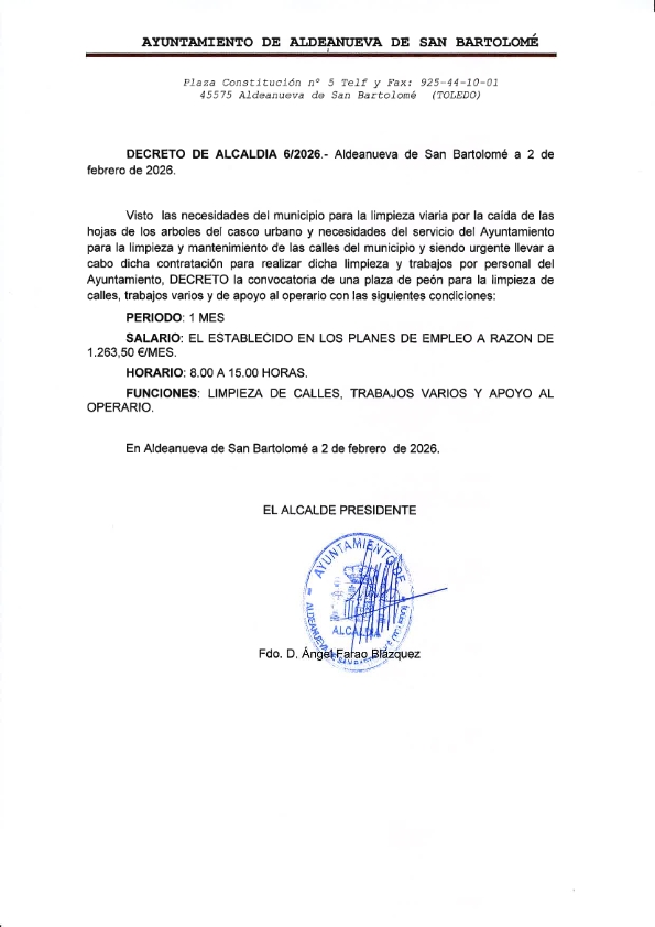 Buenos días,se adjunta DECRETO DE ALCALDÍA en el que se convoca una plaza de limpieza varia a servicio del Ayuntamiento.Interesados pueden traer DNI y Tarjeta de desempleo hasta el día 9 de febrero a las oficinas del Ayuntamiento.